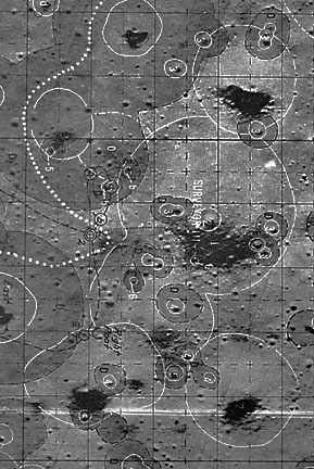 This photo is made up of Lunar Orbiter III strips showing the prime Apollo 12 lunar landing site. Scan by John Pfannerstill. Note that the small white crosses are reference marks. This photo was taken prior to the Surveyor III landing. The pattern of craters surrounding the landing site came to be known as the Snowman and the origin of the name is most easily seen in this detail of a site map prepared by geologists at the US Geological Survey in Flagstaff. The white circles surrounding the craters denote the geologists' estimates of the extent of the ejecta blankets and it is those circles that show the Snowman most clearly and, indeed, may have suggested the name.Lunar Orbiter View of the Landing Site (detail) ( 0.5Mb )