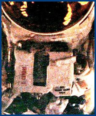 Intrepid prior to the descent. The coordinates of the center of the lunar surface shown in picture are 4.5 degrees west longitude and 7 degrees south latitude. The largest crater in the foreground is Ptolemaeus; and the second largest is Herschel. 19 November 1969.Intrepid Thru the Yankee Clipper Sextant ( 22k )
