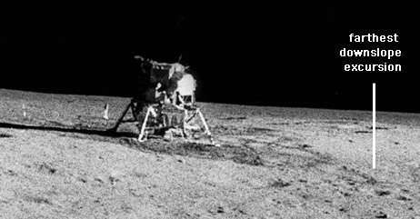 133:42:42 Well-exposed view of the LM from the southwestern rim of Surveyor Crater. Note the rearward tilt of the spacecraft. On-board measurements indicated that the spacecraft was pitched up (backwards) by 3 degrees and was rolled left (toward the camera in this picture) by 3.8 degrees. Note the heavily footprinted area southeast of the spacecraft where Pete took the 8 o'clock pan at 116:26:05. He may have also made the tracks leading a bit farther into the crater at about the same time. See a detail.AS12-49-7318 (OF300) ( 196k or 1100k )