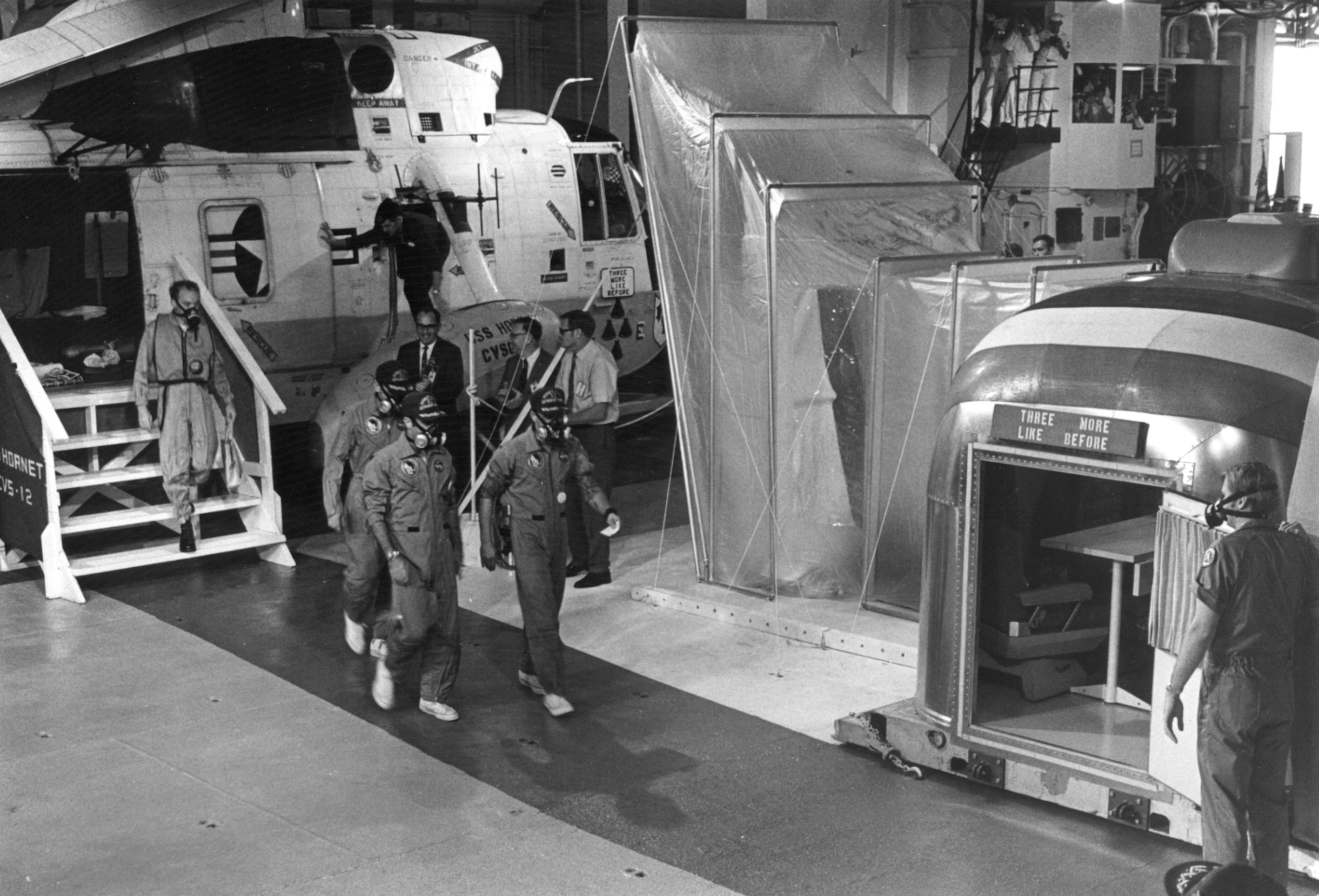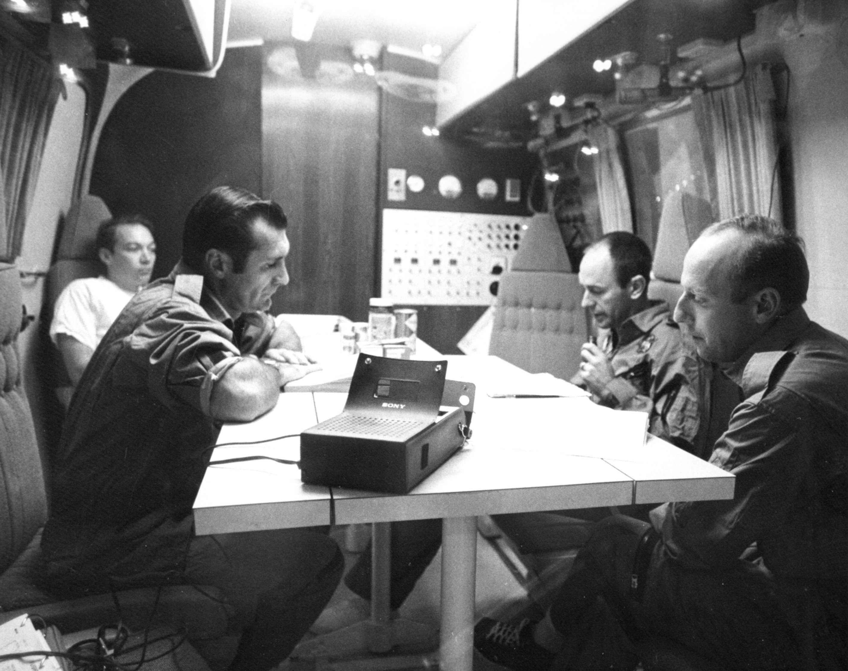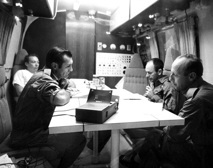 Dick Gordon (left), Al Bean, and Pete Conrad debrief in the quarantine van aboard the Hornet. 26 November 1969. Scan by Ed Hengeveld.69-H-1765 ( 96k or 984k )