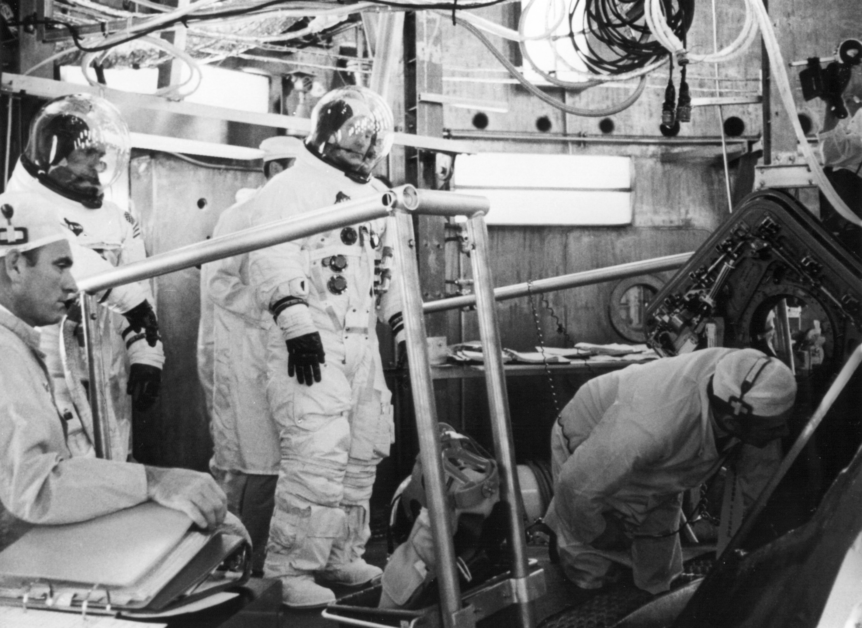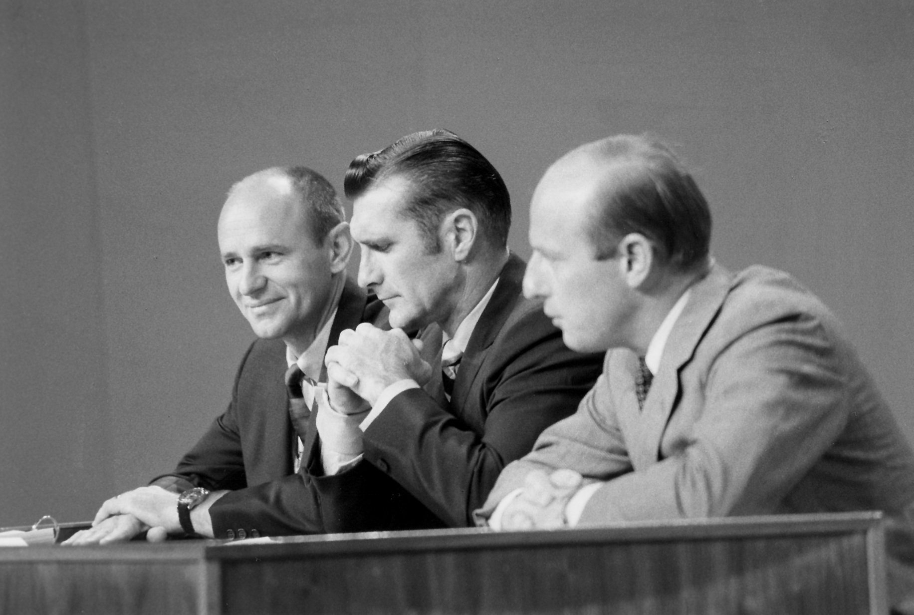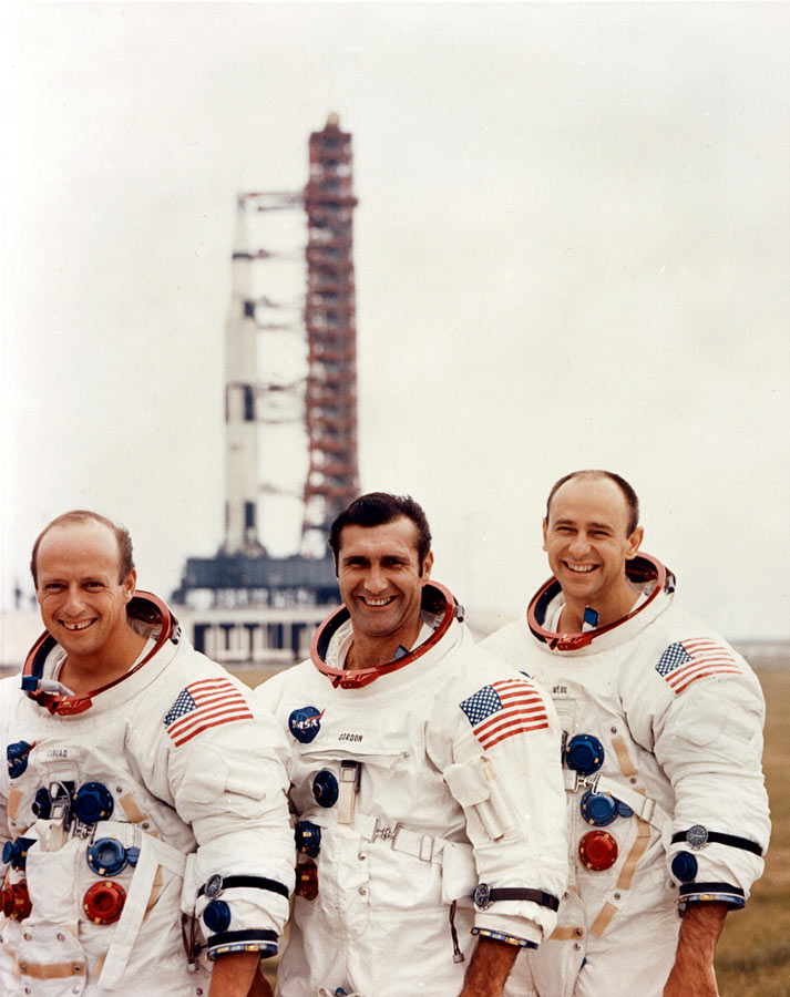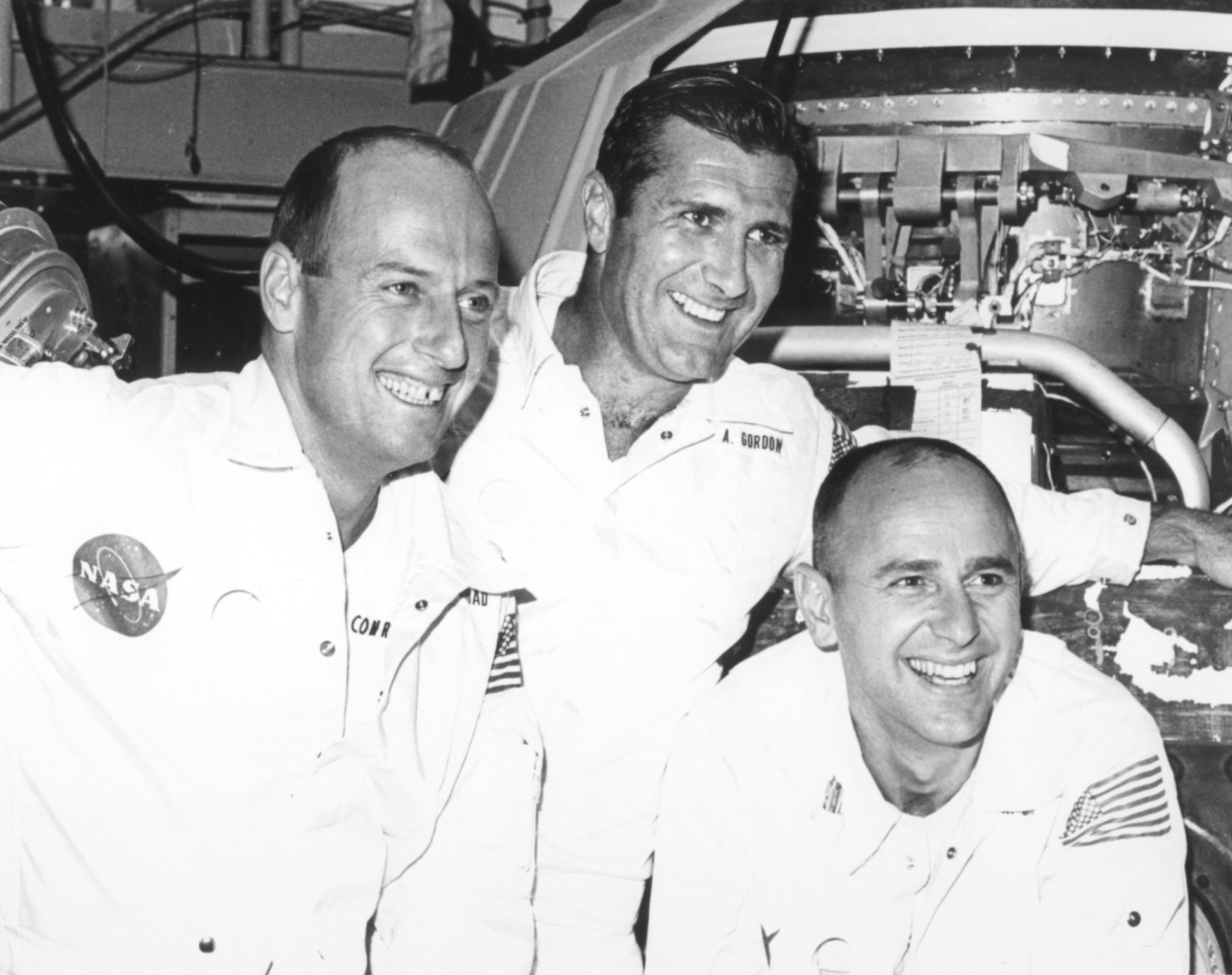 Dick Gordon (left), Al Bean, and Pete Conrad debrief in the quarantine van aboard the Hornet. 26 November 1969. Scan by Ed Hengeveld.69-H-1765 ( 96k or 984k )