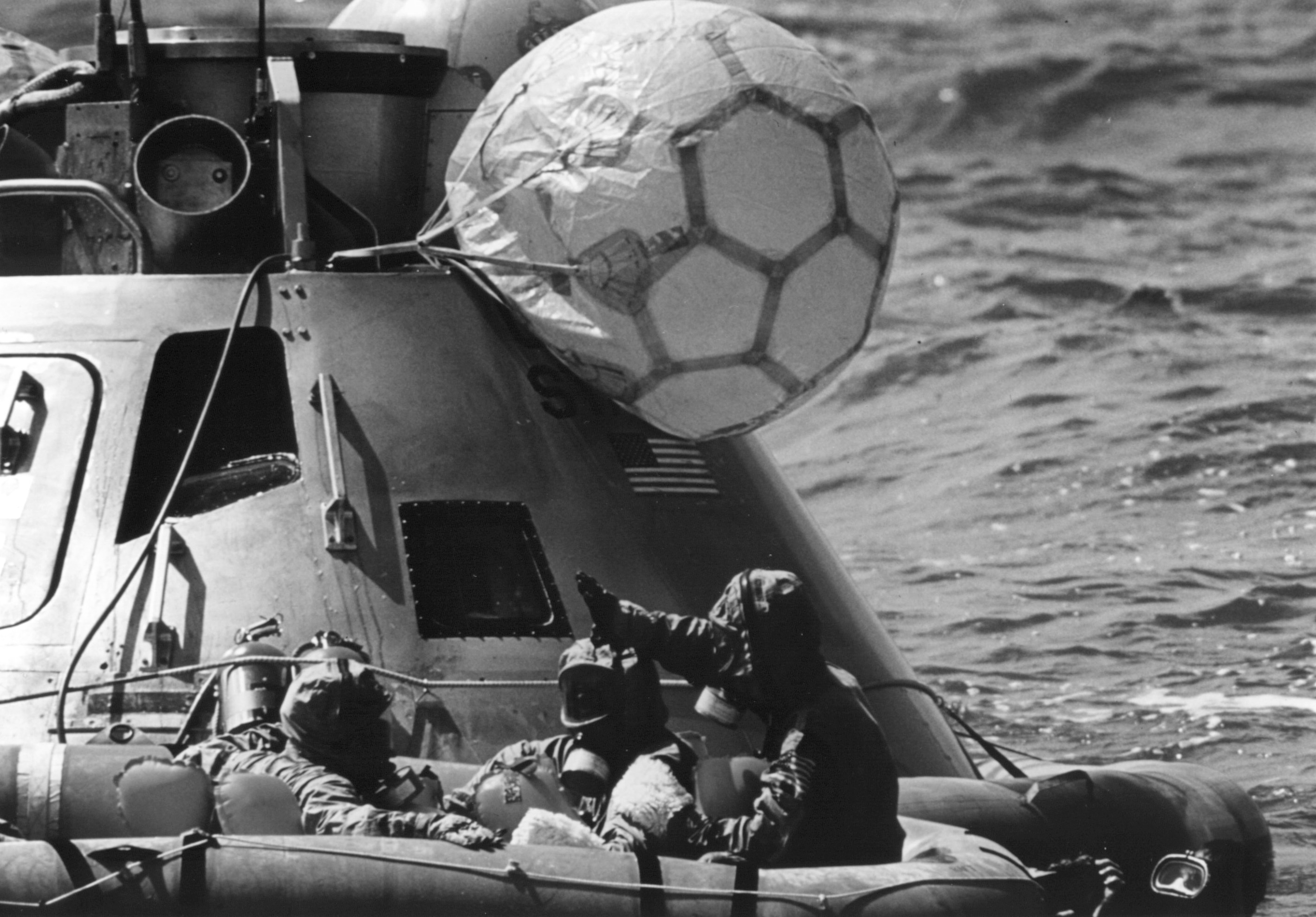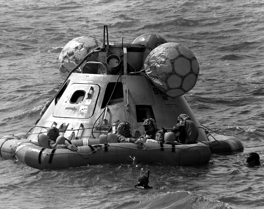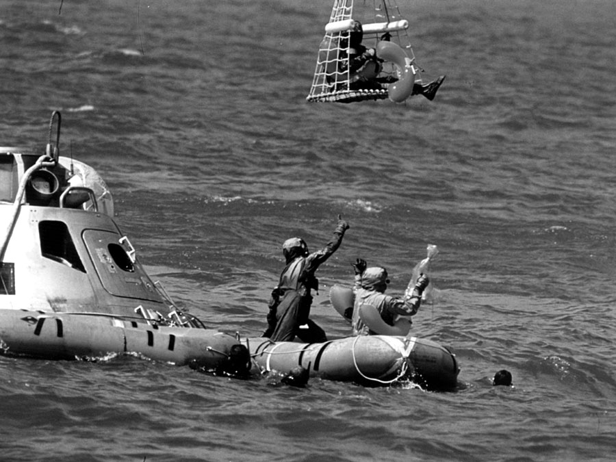 A Navy diver helps Al Bean into the recovery raft. Pete Conrad is at the far right and Dick Gordon is at the center. Note the diver in the water to the left of the raft taking pictures. Photographs are also being taken from the helicopter. 24 November 1969. Scan by Ed Hengeveld.S69-22271 ( 170k )