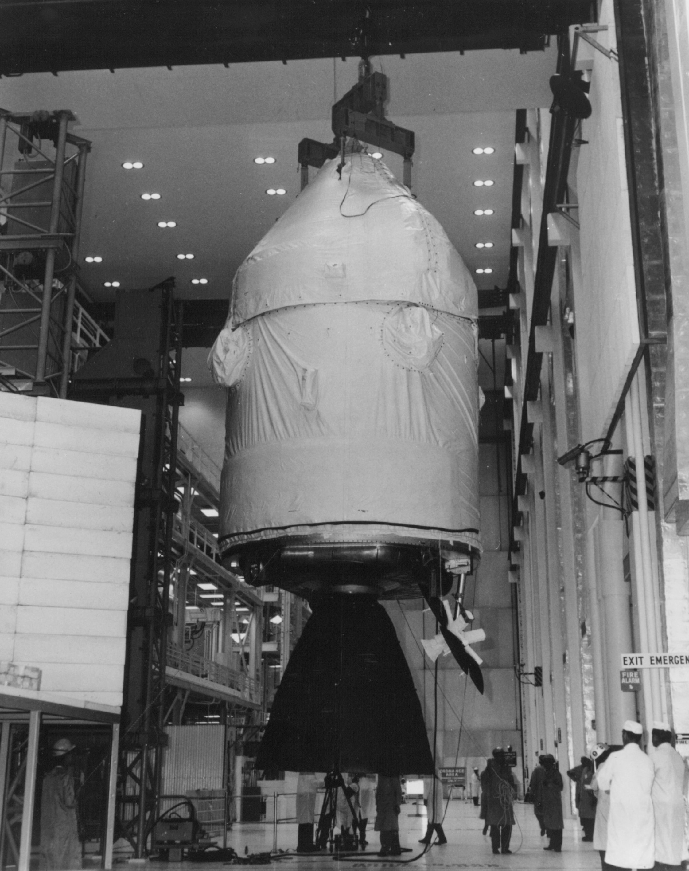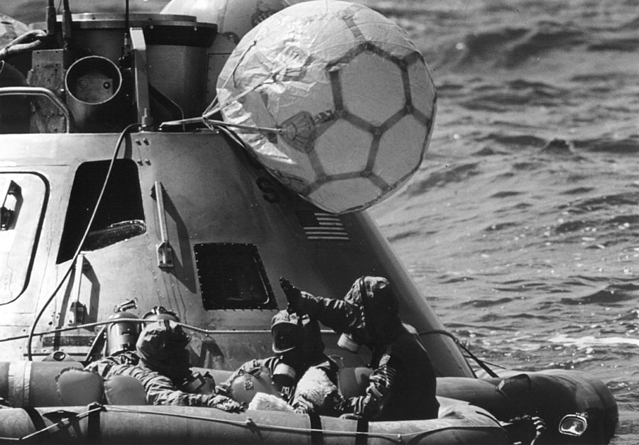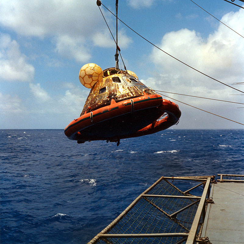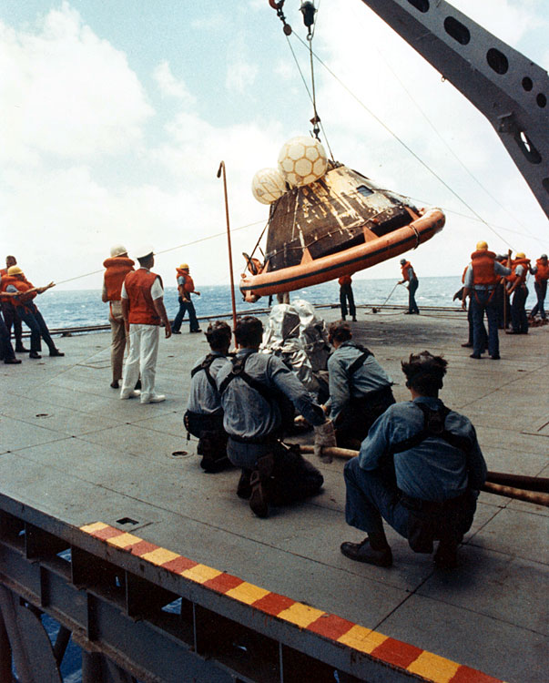 Apollo 12 CM is hoisted aboard the U.S.S. Hornet. 24 November 1969. Scan by Ed Hengeveld.S69-22849 ( 151k or 815k )