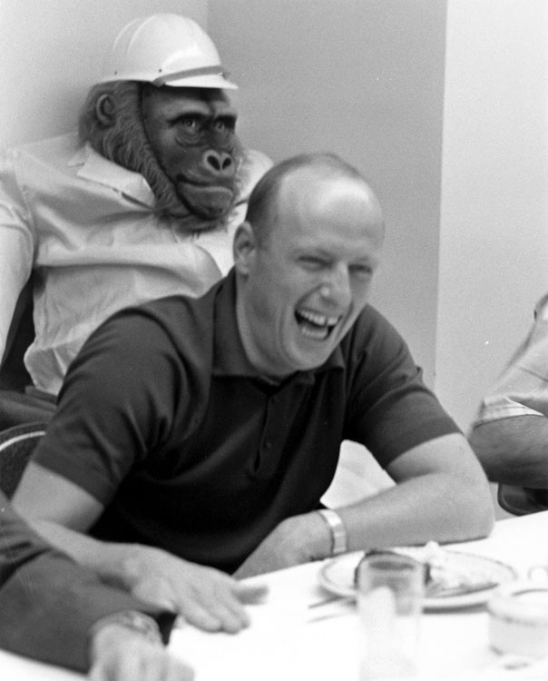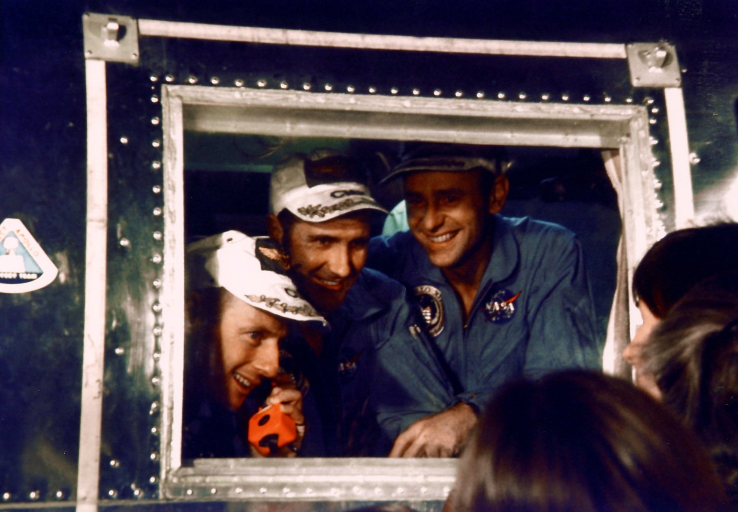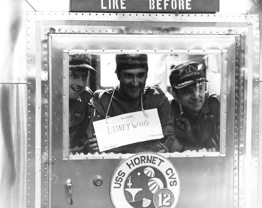 Pete Conrad (left), Dick Gordon, and Al Bean at the window of the quarantine van aboard the Hornet. They have just performed an equator-crossing ceremony on Gordon, who has his uniform backwards for the occasion. 27 November 1969. Scan by Ed Hengeveld.69-H-1766 ( 117k or 1078k )