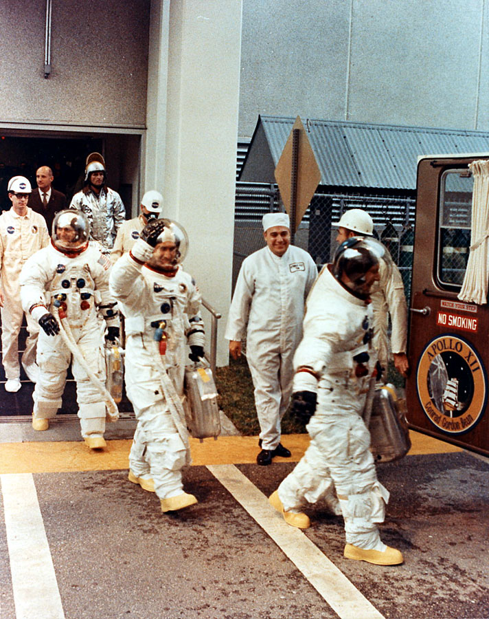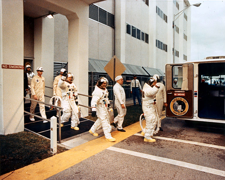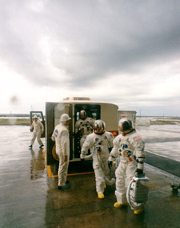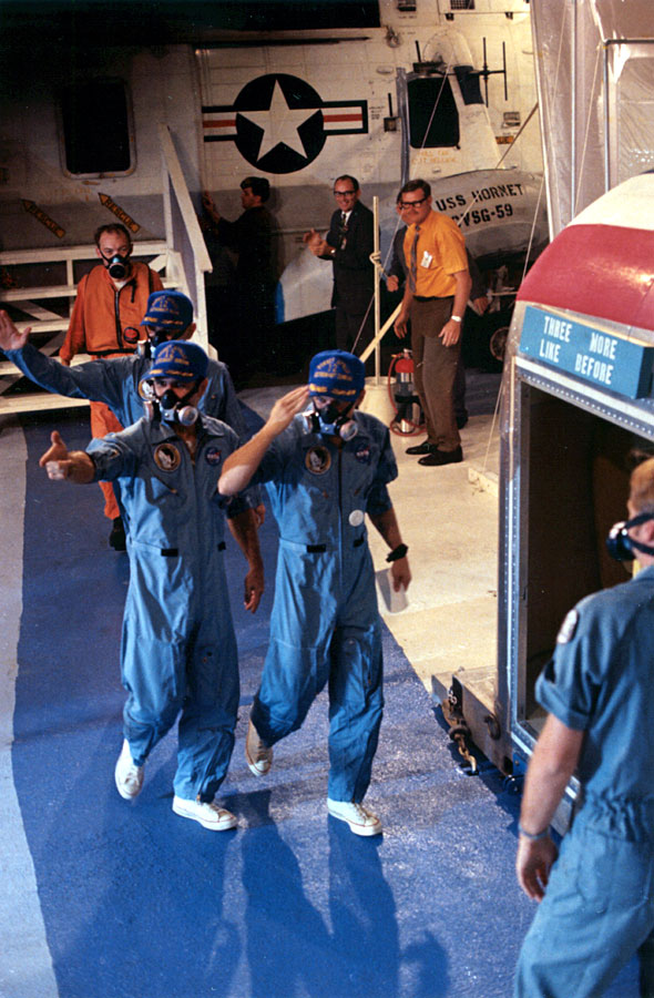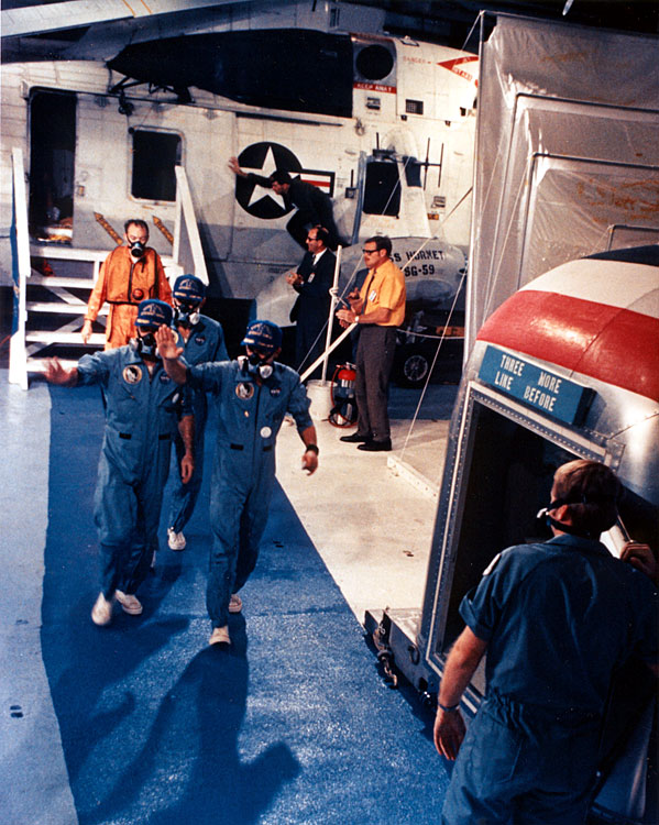 Apollo 12 crew walks to the quarantine van. 24 November 1969. Scan by Ed Hengeveld.69-H-1885 ( 128k or 984k )