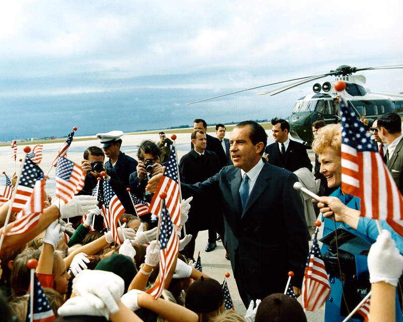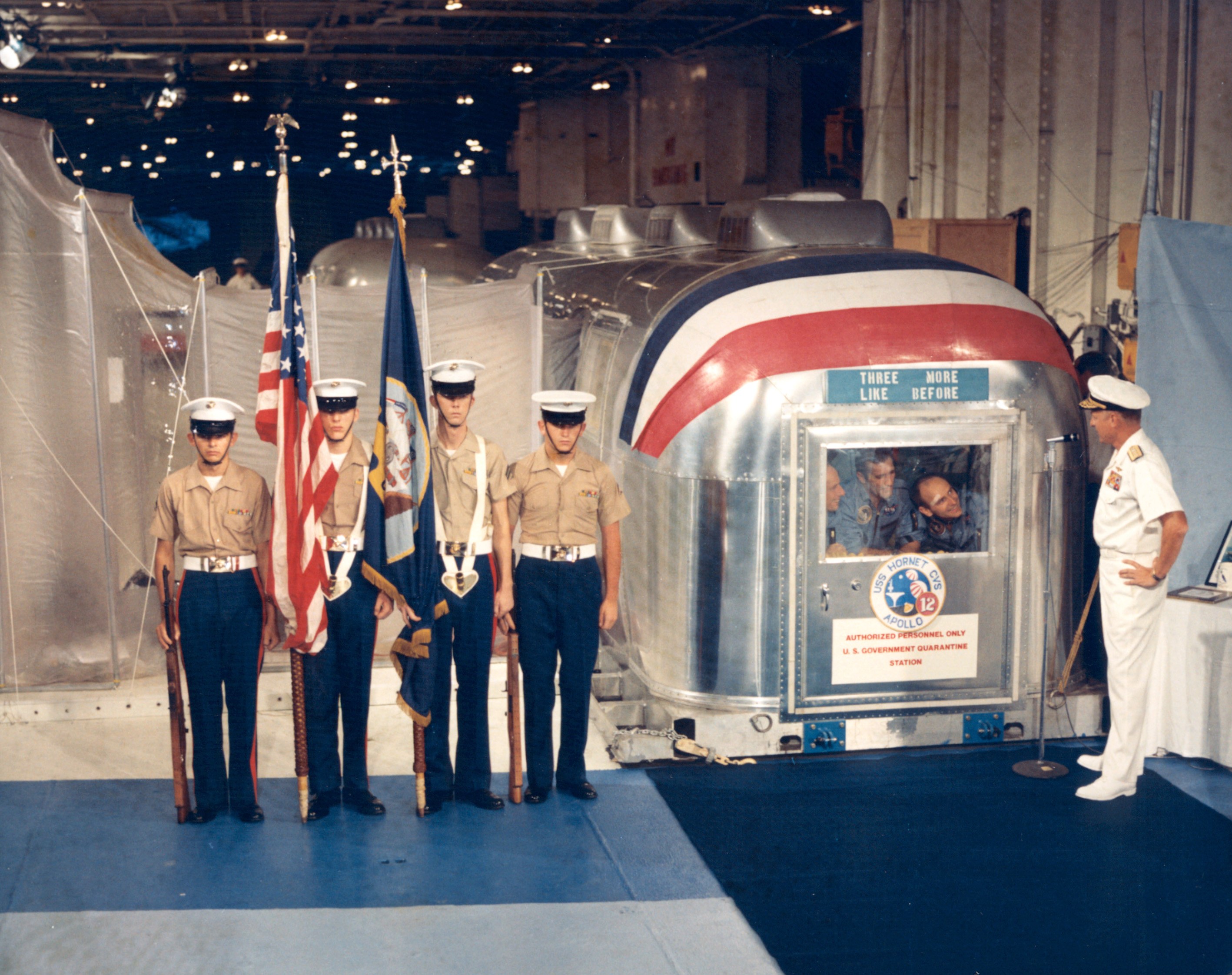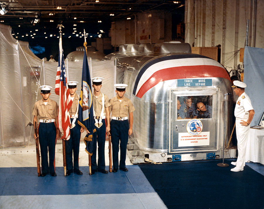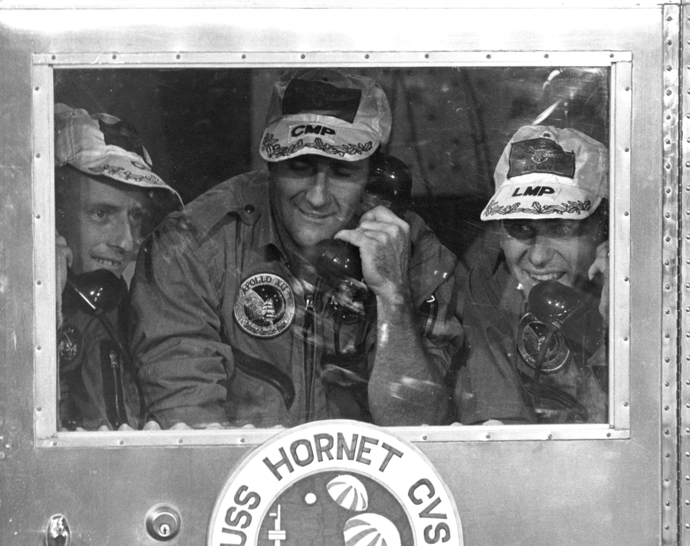 Pete Conrad (left), Dick Gordon, and Al Bean speak with President Nixon by phone from the quarantine van during welcoming ceremonies aboard the Hornet. 26 November 1969. Scan by Ed Hengeveld.69-H-1763 ( 118k or 1209k )