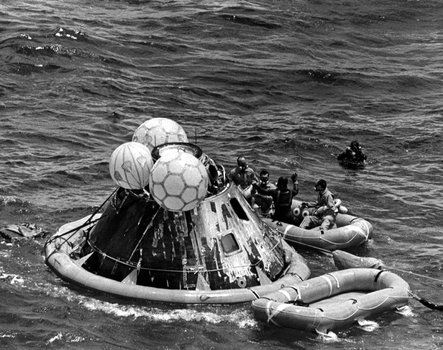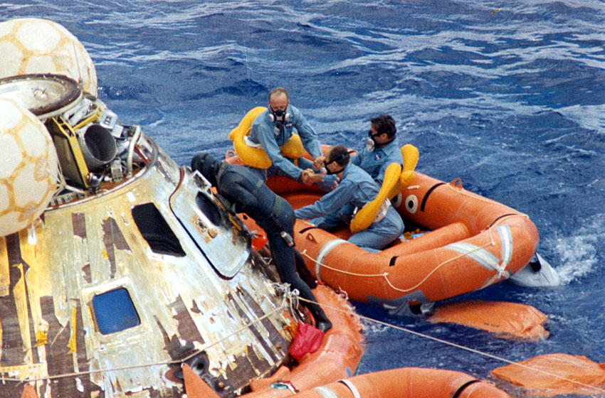 Al Bean (foreground) joins Dick Gordon (immediately behind Al), and Pete Conrad (shaking Al's hand) in the recovery raft. Pete appears to have Dick's right hand while Dick's left hand is on Al's elbow, perhaps to steady Al. 24 November 1969. Scan by Ed Hengeveld.69-H-1895 ( 179k or 1286k )