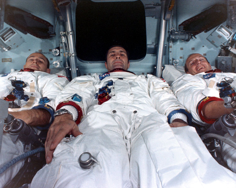 Pete Conrad (left), Dick Gordon, and Al Bean in the quarantine van. 24 November 1969. Scan by Ed Hengeveld.S69-60760 ( 188k )