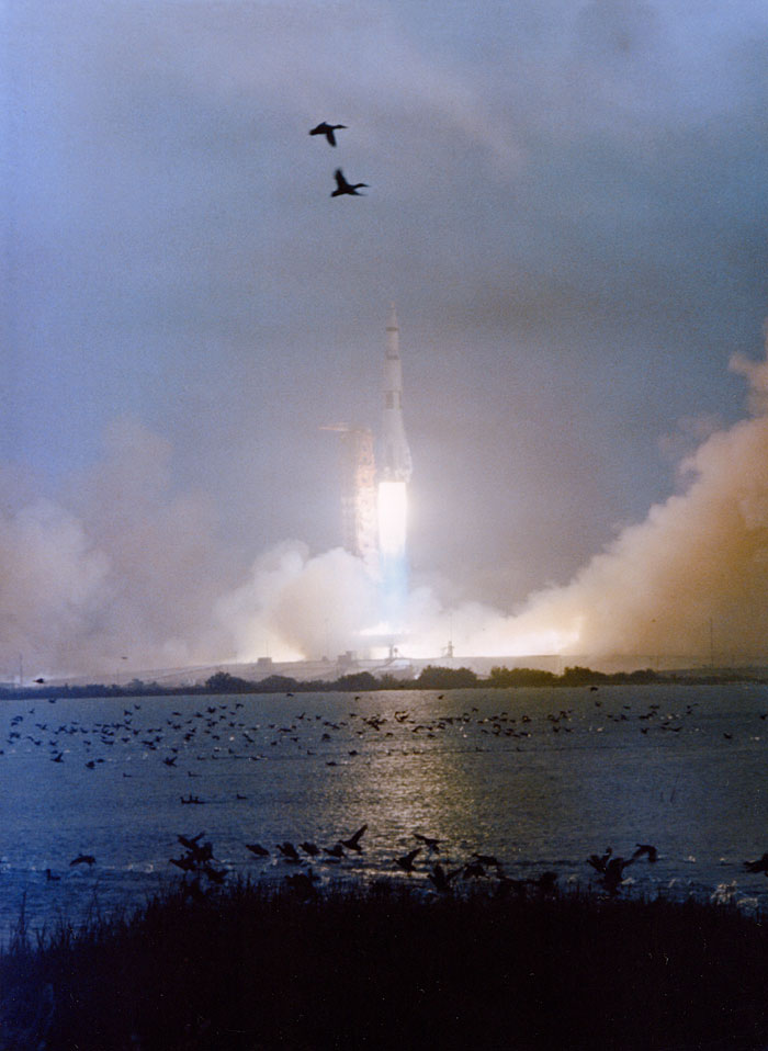 This photo shows the Spacecraft-LM Adapter (SLA) above center. Baja Califonia is on the right side of the image and the Yucatan Penninsula is at bottom center. Scans by Kipp Teague.AS12-50-7369 ( 128k or 449k )