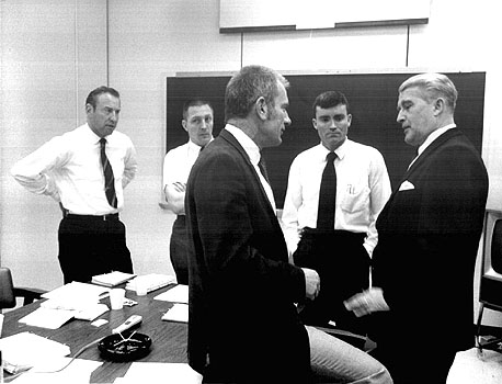 [NASA photo S70-35748 shows Deke Slayton (center foreground), Jim Lovell (left rear), Jack Swigert (center rear), and Fred Haise (center right) meeting with Wernher von Braun on 20 April 1970, three days after the crew's splashdown in the Pacific.]The main trouble with such accidents is that they have the potential of causing real political mischief. Although the death warrant for Apollo had already been signed in January 1970 - with the assembly lines shutdown and one of the remaining missions cut from the schedule for lack of funds - it is not coincidental that two more missions were dropped in the interval following the accident. Congressional support for Apollo had been weak for years and now there was a new President who was less than an ardent fan; and, while prediction of the political impact of serious accidents is far from an exact science, any accident was bound to raise questions about the credibility of NASA and its programs. As both the Apollo fire and the Challenger accident of the Shuttle era indicate, serious accidents do not necessarily doom a program but, given the expense and high visibility of such enterprises, the political risks are considerable.