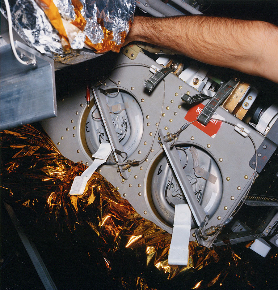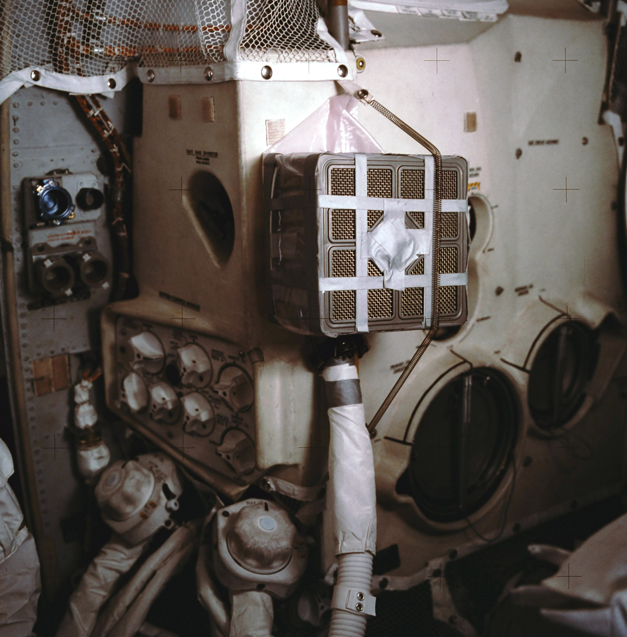 Inflight photo of the device constructed by the crew from duct tape, maps and other materials they had on hand as per instructions provided by Houston. This device allowed use of box-shaped Command Module lithium hydroxide canisters in conjunction with the LM Environmental Control system, which is the large white unit that fills most of the frame. The LM LiOH canisters were cylindrical in shape and fit into the receptacles at the lower left. Compare with the LM-ECS diagram ( 245k ). Scan by John Fongheiser.AS13-62-9004 ( 144k or 682k )