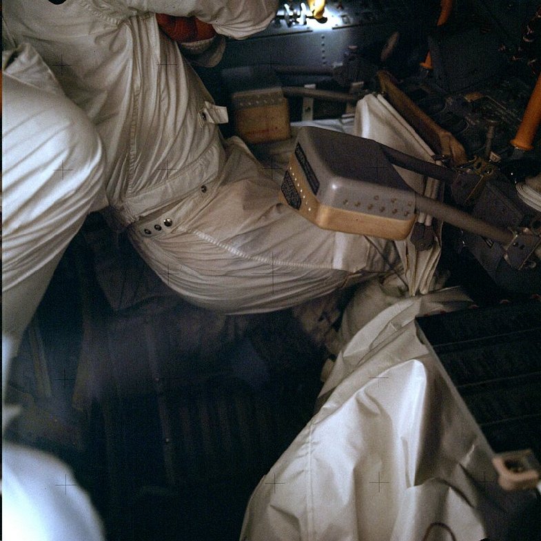 Fred Haise (foreground left) and Jim Lovell separate core stem sections using a hand wrench. Jim's yo-yo is clearly visible on his left hip and, as indicated in a detail, we have a clear view of the curved armband and spiral binding of the cuff checklist. The set of five small objects visible between his hands are core stem caps. The different colors of the OPS antennas is clear in this picture. Note that Fred has the DAC mounted on his RCU and that there is a tempa-label on the handle of his UHT. Photo filed 3 February 1970. Scan by Kipp Teague.70-HC-84 ( 128k or 947k )