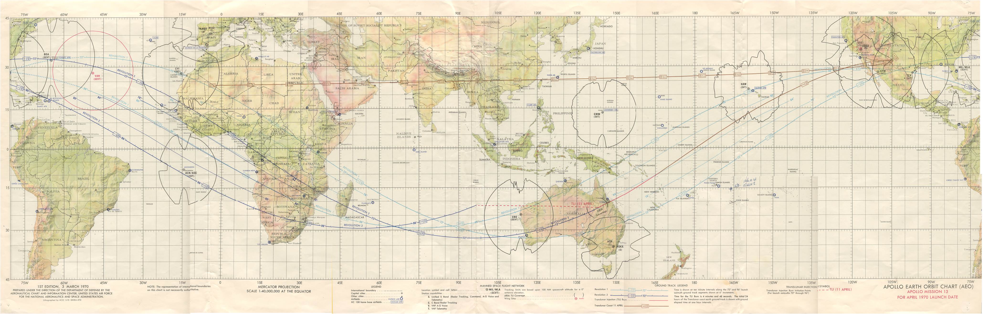 This Mike Dinne was the Deputy Director at NASA's Honeysuckle Creek Tracking Station during Apollo and provides a scan of a map he used during Apollo 13. It shows the post-launch Rev 1 and 2 ground tracks for launches at the beginning and end of the launch window. An on-time launch would have left the Cape on an azimuth of 72 degrees while a launch at the end of the window would have left on an azimuth of 96 degrees. Apollo 13 launched on time. Mike marked the splashdown location soon after the crew was safely recovered.Jim Lovell's EV Gloves ( 38k )