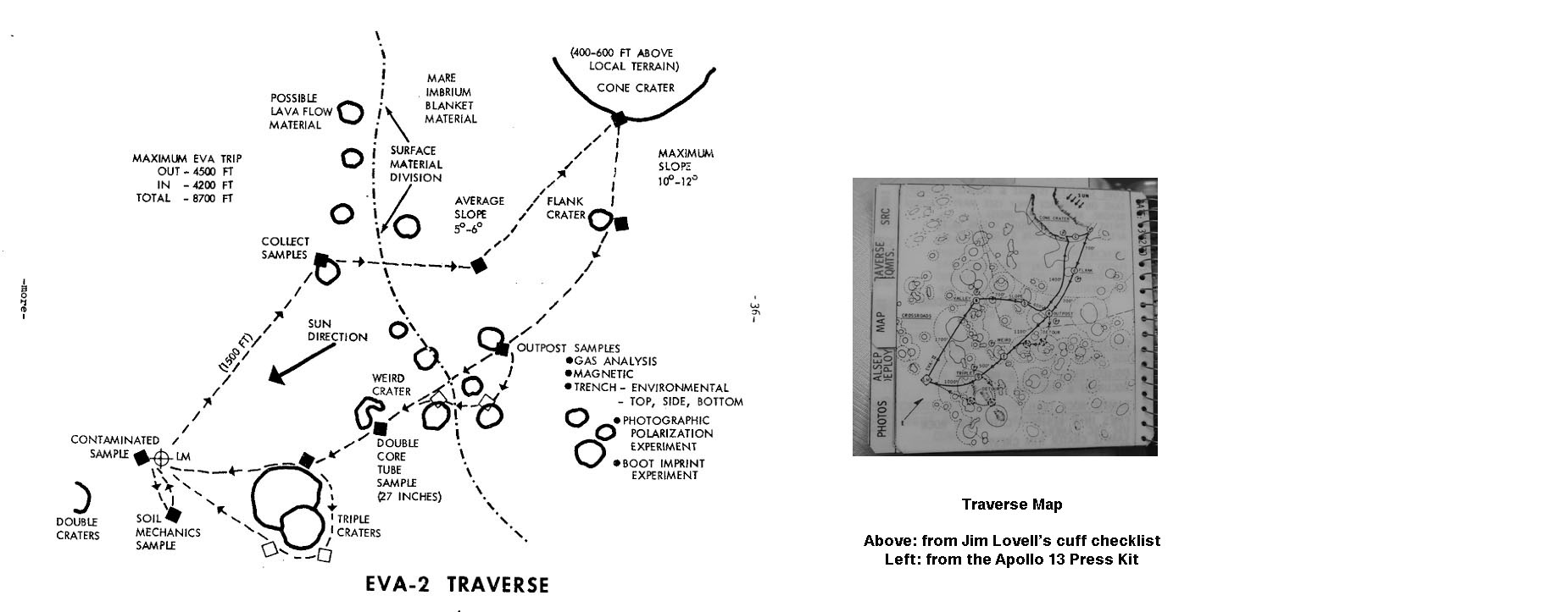 The seven planned sampling locations are: Valley (7 minutes), 1700 feet northeast of the LM before they start up Cone Ridge; Slope (10 minutes), 700 feet farther east and partway up slope on the flank of Cone Ridge; Cone (30 minutes) at two locations on the rim of Cone Crater; Flank Crater, 700 feet downslope from the Cone rim, same location as Apollo 14's planned Station D; Outpost (30 minutes) with details given three pages farther on in the checklist, similar location to Apollo 14 planned Station E; Weird Crater (15 minutes), same location as Apollo 14's planned Station F; Triplet Craters (7 minutes) same location as Apollo 14's planned Station G.