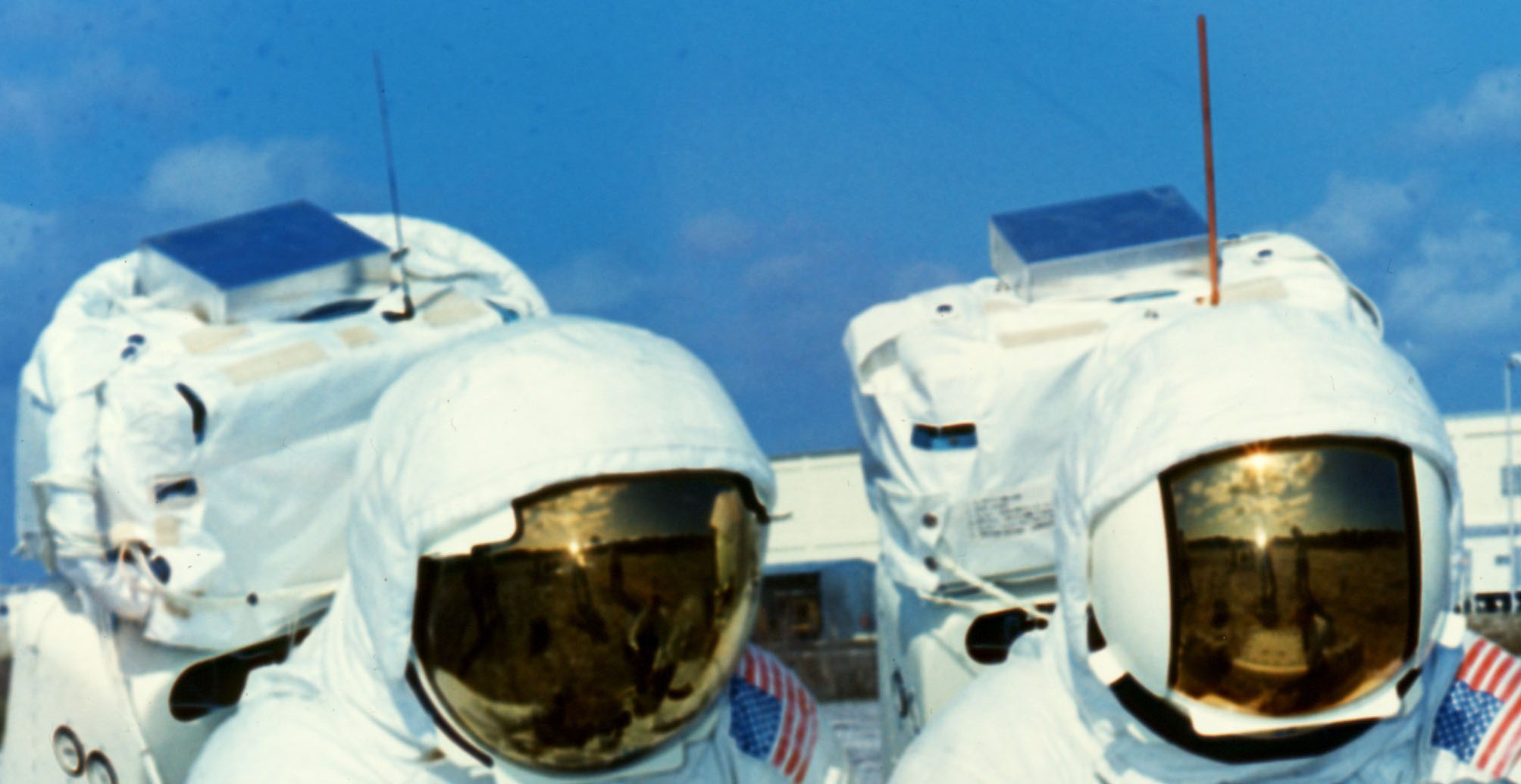 Fred Haise (red antenna, facing us) and Jim Lovell with the Hand Tool Carrier (HTC). Photo filed 3 February 1970. Scan by Kipp Teague.KSC-70PC-0016 ( 120k )