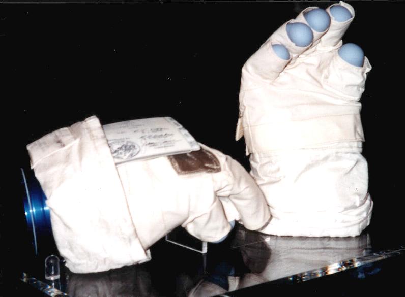 This Ulrich Lotzmann photo shows the gloves on display at the Adler Planetarium in Chicago.Jim Lovell's left EVA Glove, Cuff Checklist, and LEVA (1.3 Mb)