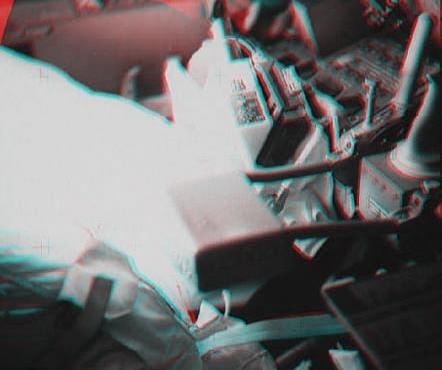 Jim Lovell in the LM, preparing it for jettison. Journal Contributor Mike Poliszuk notes that the DSKY display, visible to the right of Jim's elbow, shows "his computer is in 'Poo', i.e. Program 00, idling. It is powered on but not doing anything. See an enhanced detail from the high resolution scan. Apollo 13 is the only Apollo flight in which interior shots were taken with a Hasselblad with a Reseau plate installed. This camera would have been used for EVA shots had they landed." Scan courtesy Kipp Teague.AS13-59-8490/1 Red-Blue Anaglyph ( 20k )