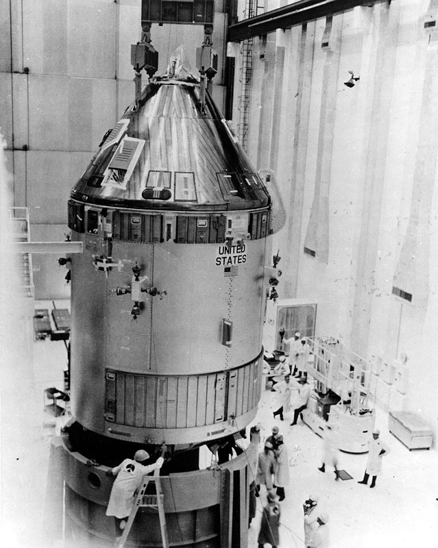 Apollo 13 spacecraft before mating to launch vehicle in VAB. Photo dated 10 December 1969. Scan by Kipp Teague.69-HC-1147 ( 176k or 1569k )