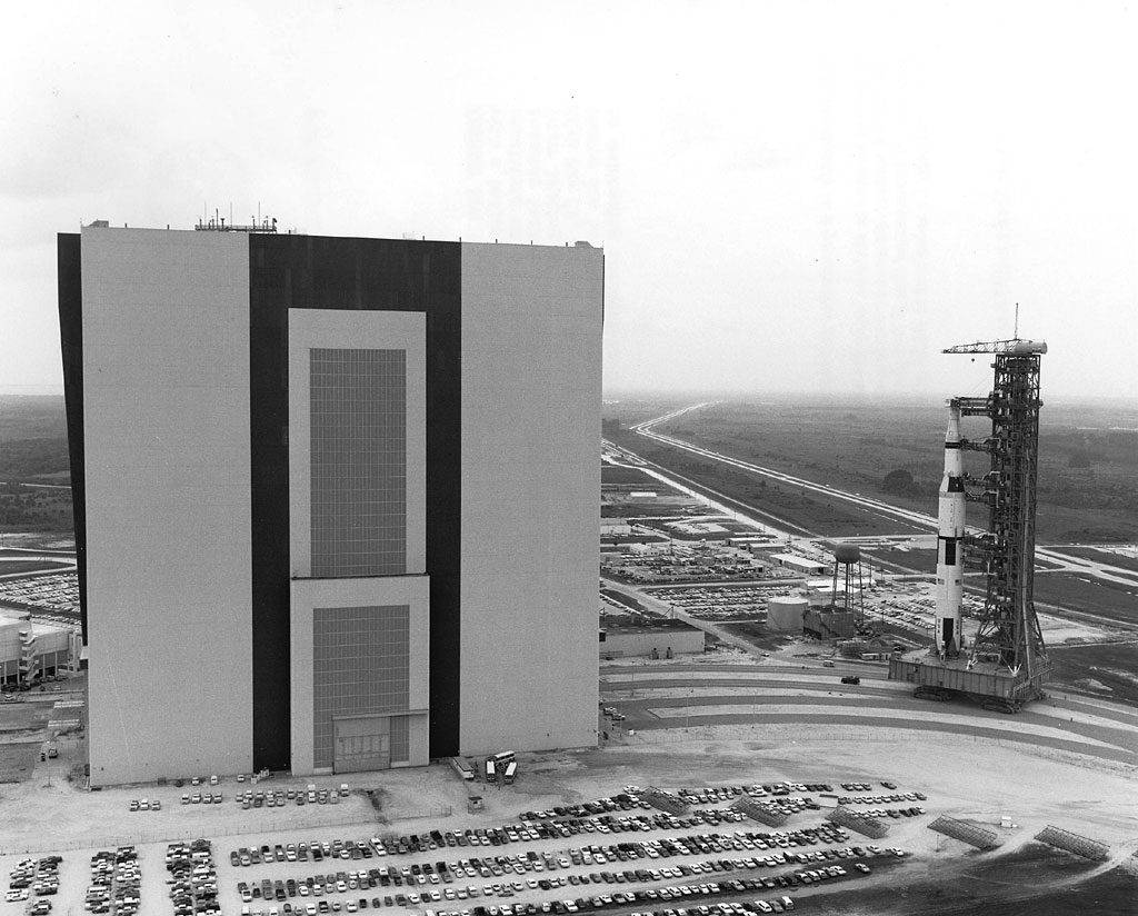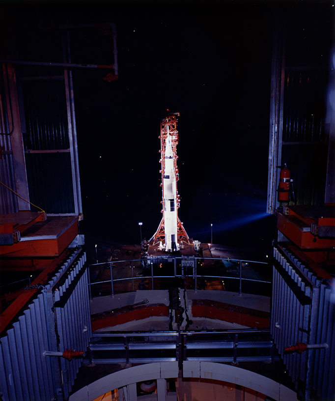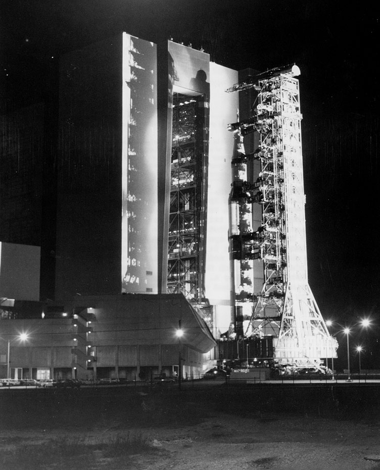 Apollo 13 Saturn V with boilerplate spacecraft during transfer move from High Bay 2 to High Bay 3. 8 August 1969. Scan by J.L. Pickering.69-HC-1048 ( 136k or 853k )