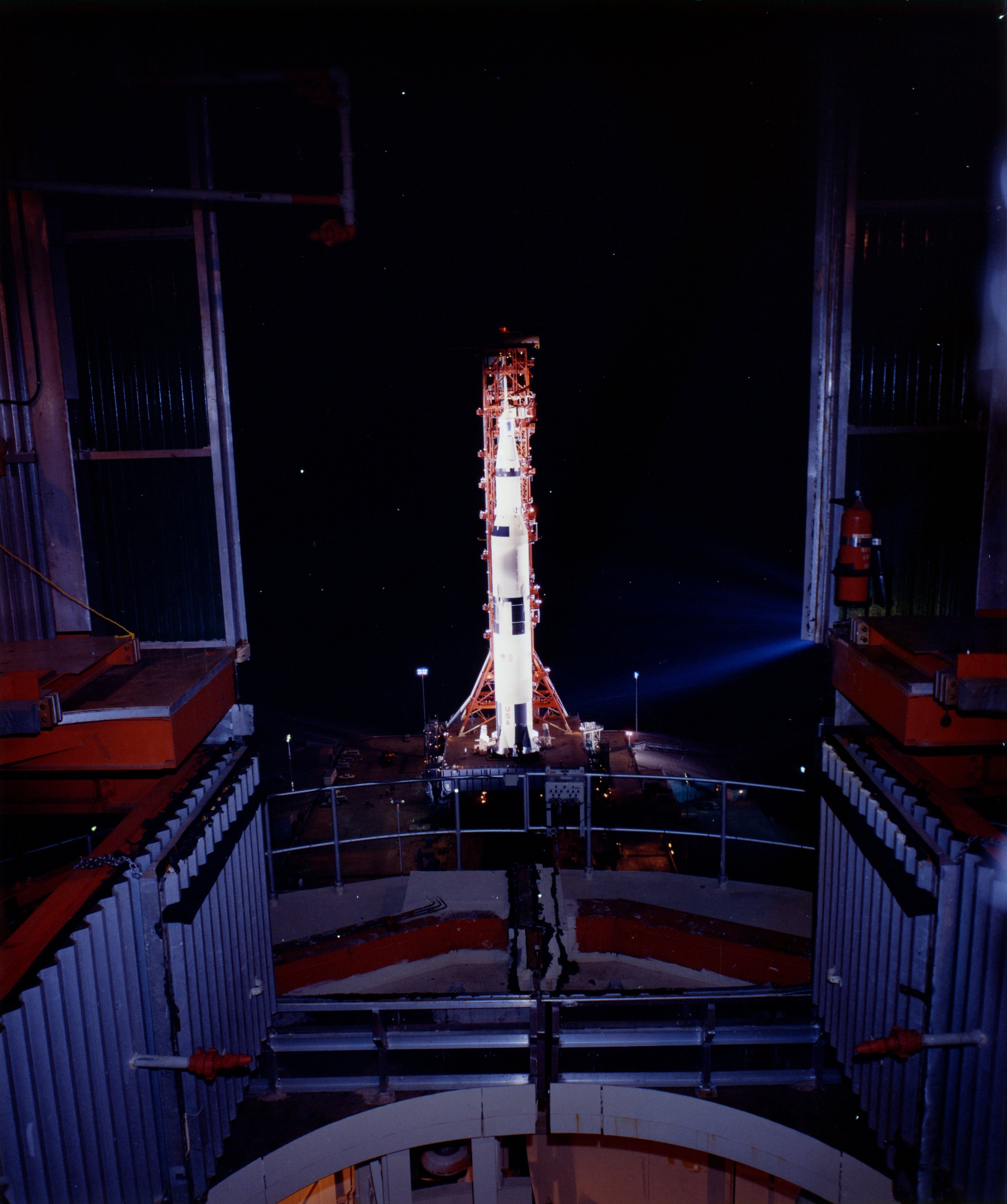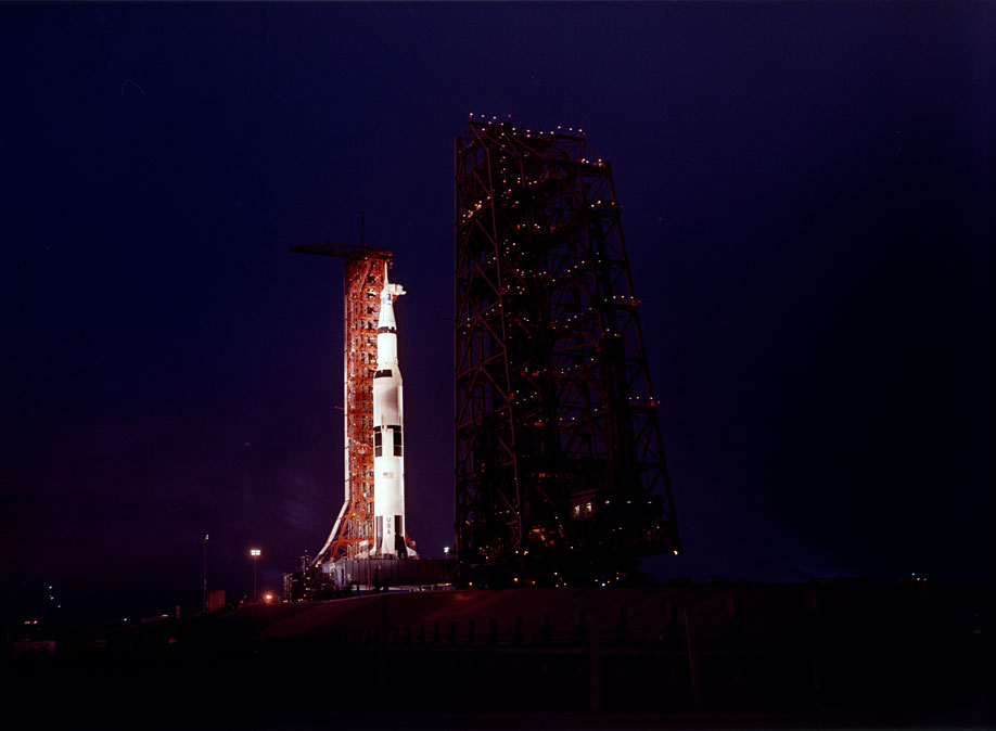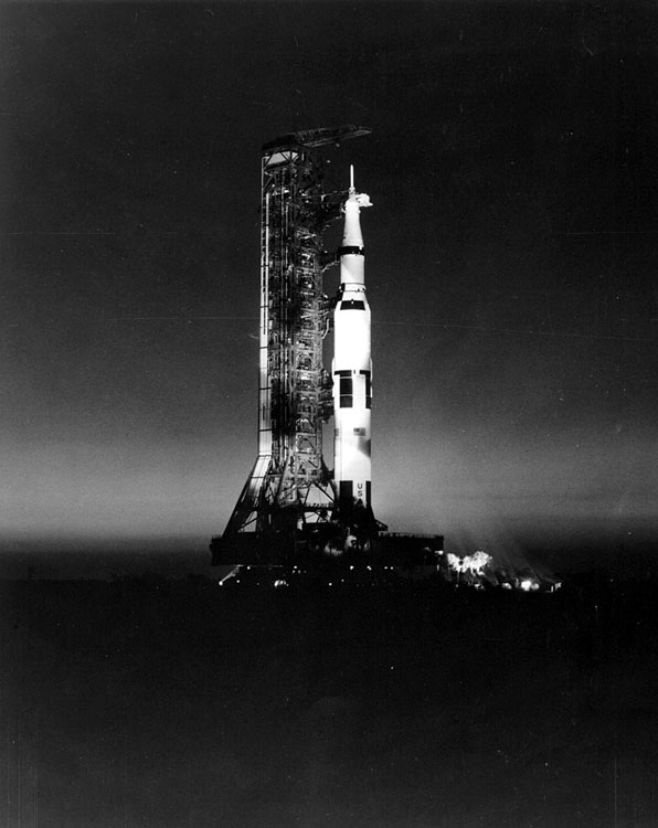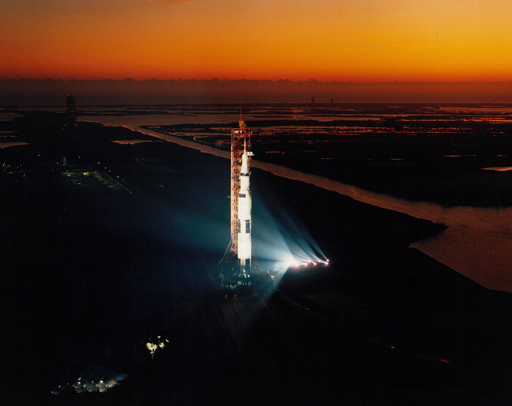 Apollo 13 bathed in floodlight during early-morning rollout. 16 December 1969. Scan by J. L. Pickering.69-H-1911 (58k )