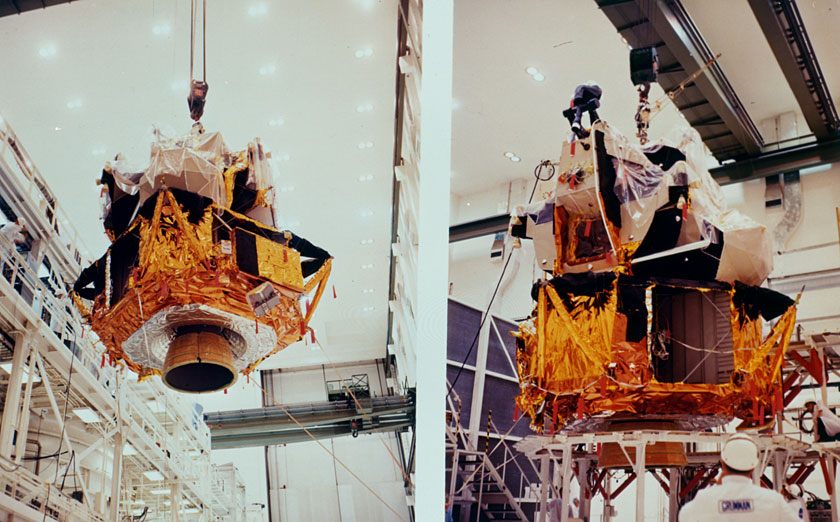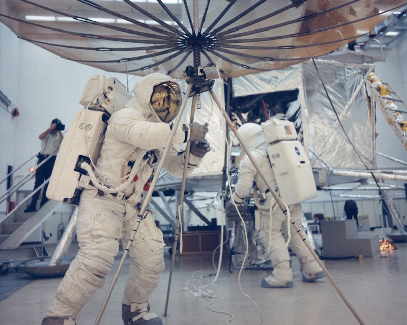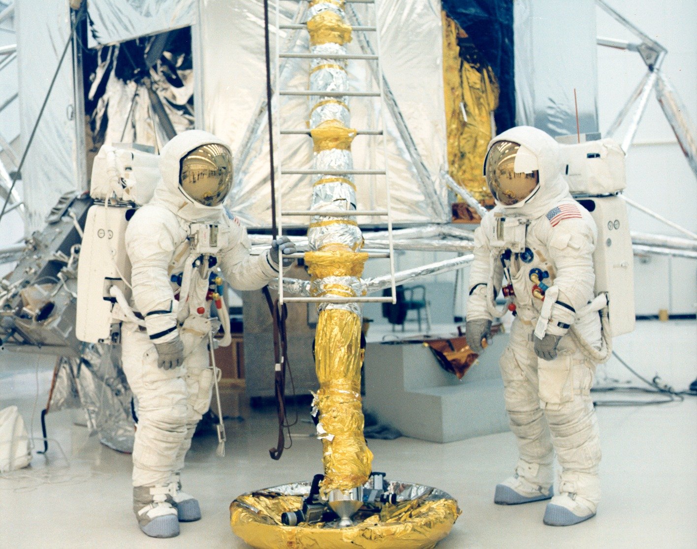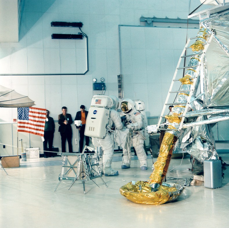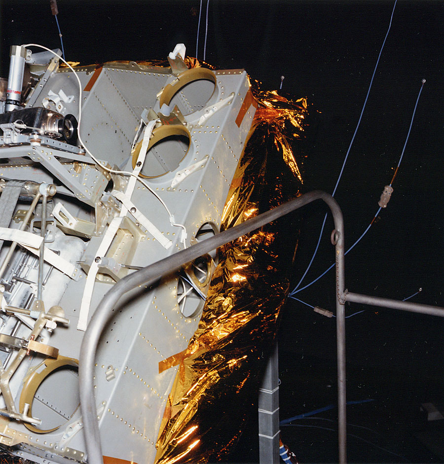 Apollo 13 Training MESA on the left with some thermal blankets. 1969. Scan by Kipp Teague.S69-57066 ( 241k or 579k )