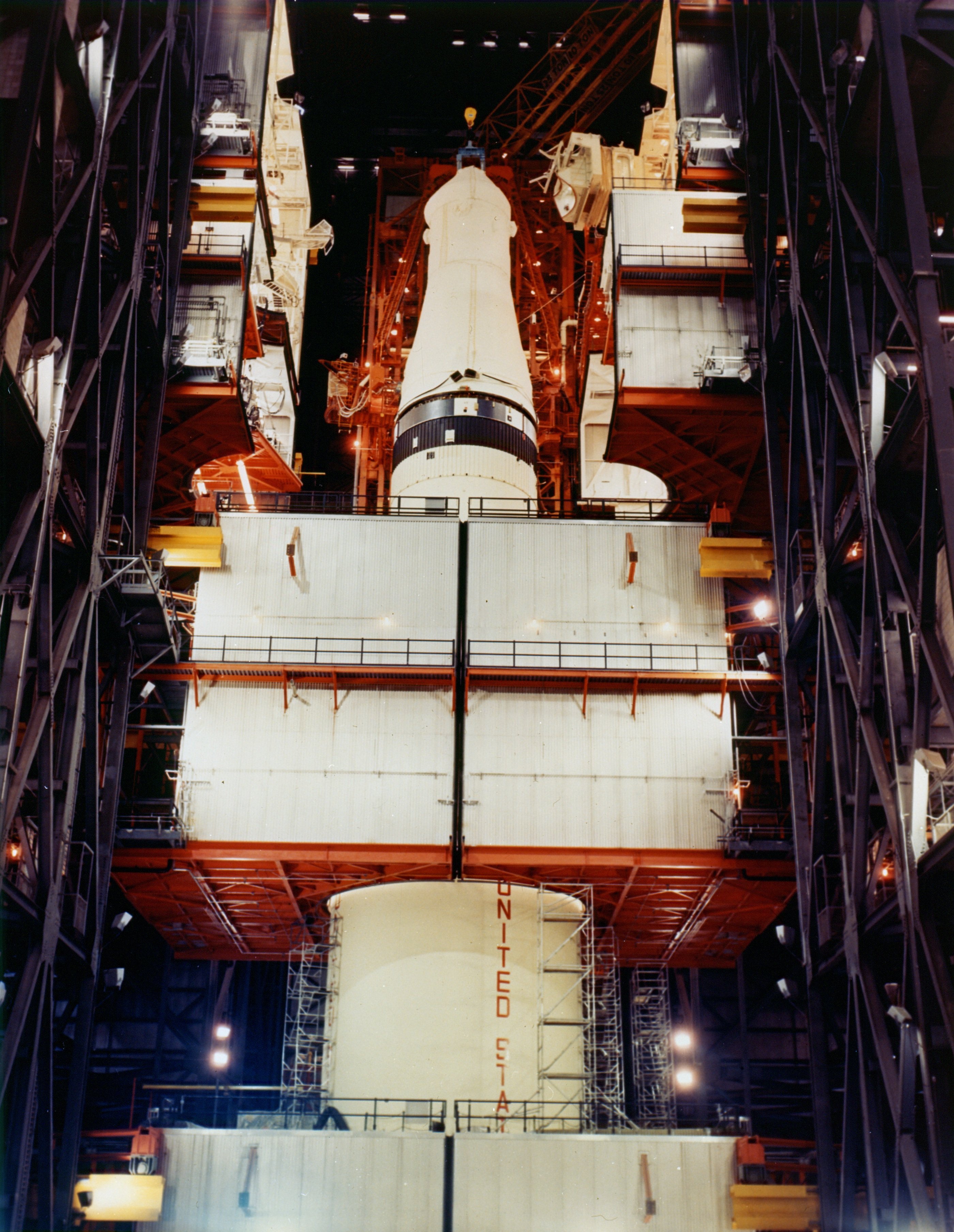 Apollo 13 Saturn V in VAB during mating of spacecraft. Photo dated 10 December 1969. Scan by Kipp Teague.KSC-69PC-820 ( 92k or 1001k )