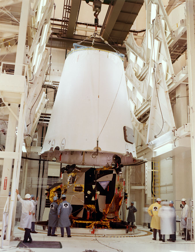 The third stage adapter is lowered into place over the Lunar Module during stacking in the VAB. 1969. Scan by Kipp Teague.69-H-1792 ( 115k )