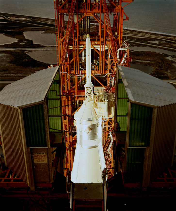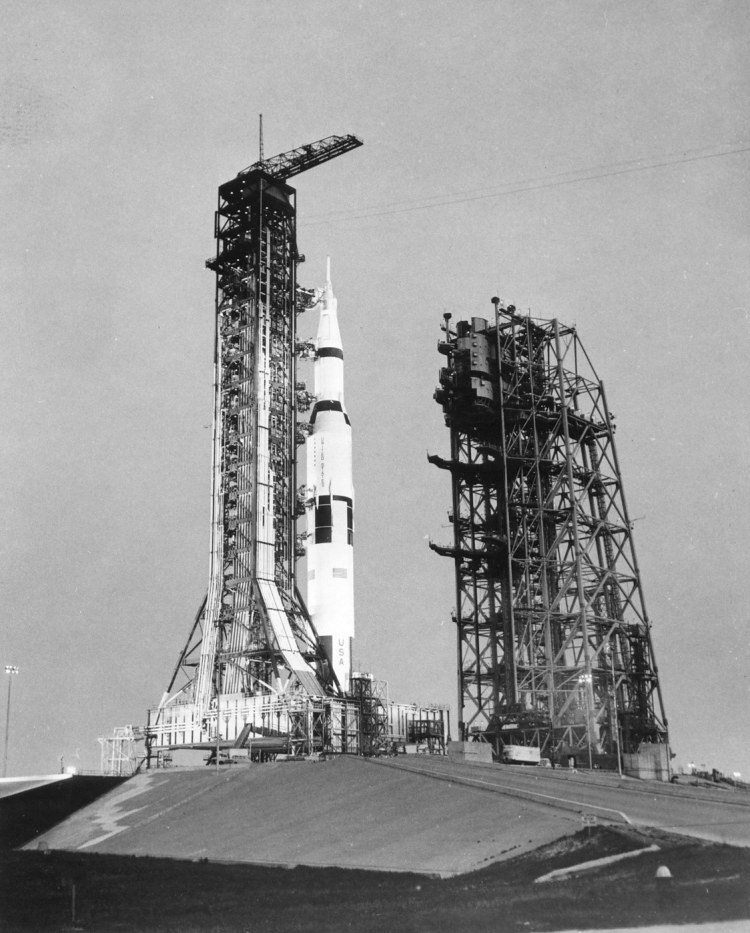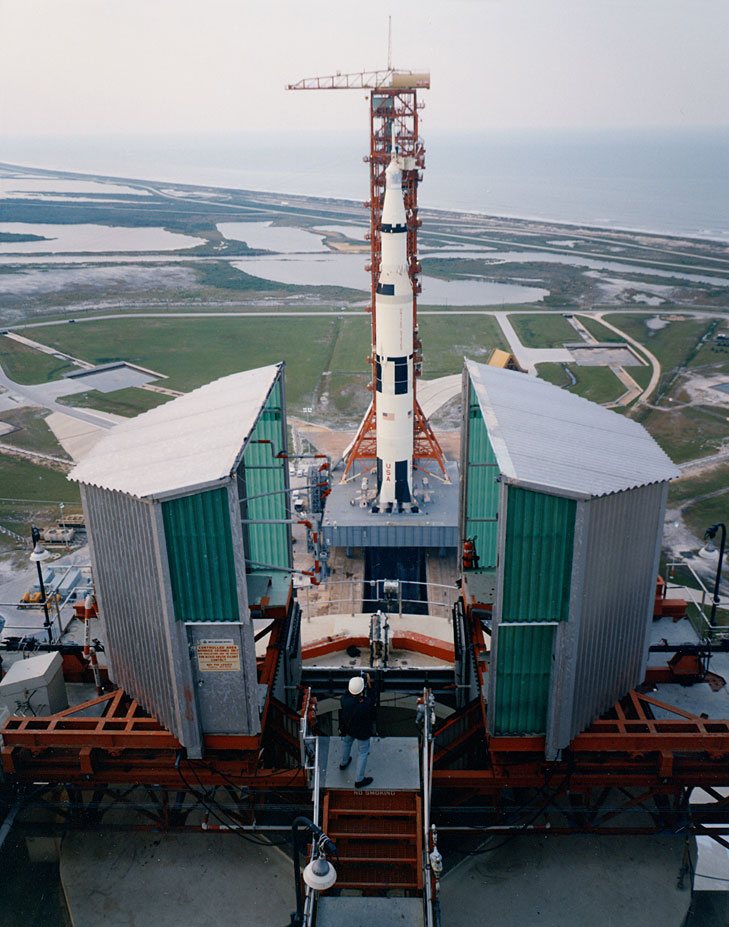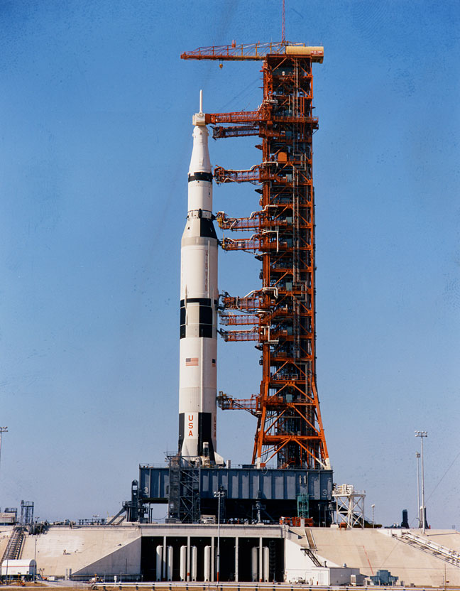 Apollo 13 Saturn V on the pad enclosed in the Mobile Service Structure (MSS). Scan by J.L. Pickering.KSC-70C-1499 ( 156k or 1211k )