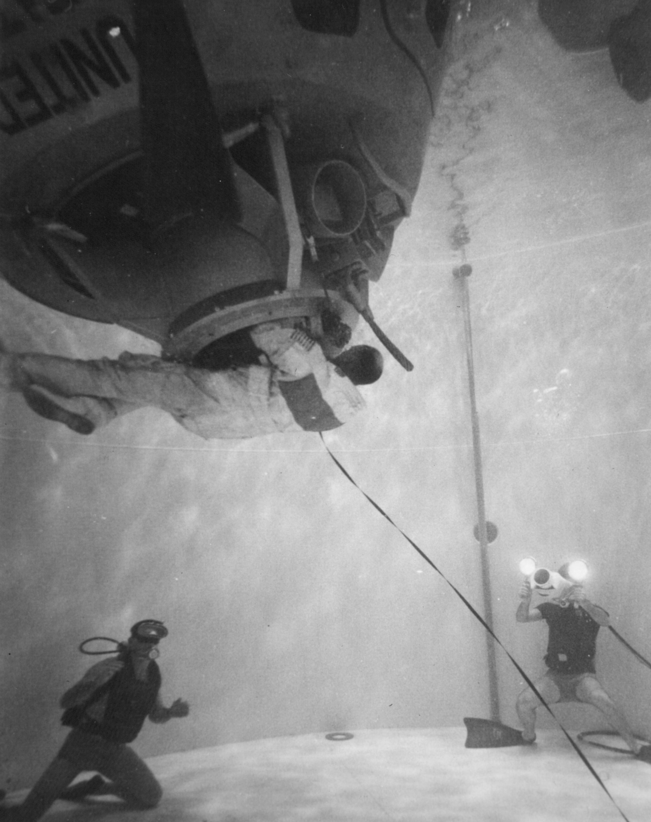 Apollo 13 water egress training in Gulf of Mexico. Photo filed 24 February 1970. Scan by Ed Hengeveld.S70-30579 ( 114k or 771k )