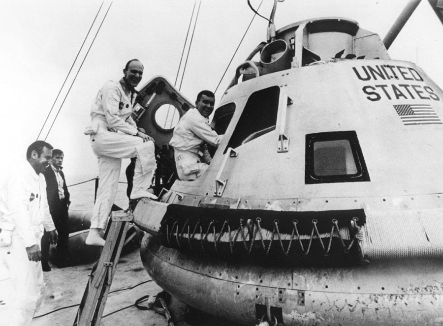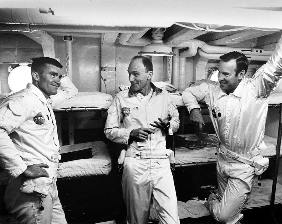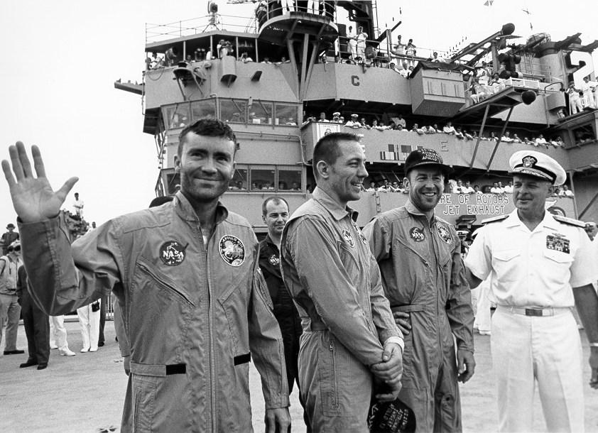Rear Admiral Donald C. Davis (USN), Recovery Task Force Commander, welcomes Fred Haise (left), Jack Swigert, and Jim Lovell aboard the U.S. Iwo Jima after their safe return to Earth. 17 April 1970. Scan by Kipp Teague.S70-15520 ( 261k )