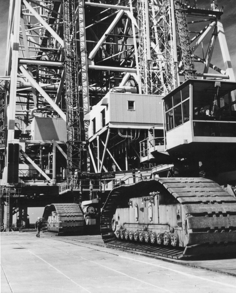 The crawler is moved into position under the Mobile service Structure. Photo dated 24 March 1970. Scan by Ed Hengeveld.70-H-448 ( 140k )