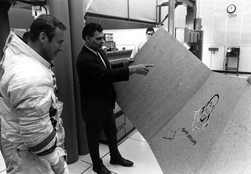 Jim Lovell celebrates his 42nd birthday. This is the earliest picture currently in the ALSJ that shows Jim with red stripes on his suit. Photo filed 25 March 1970. Scan by Kipp Teague.70-H-444 ( 95k )