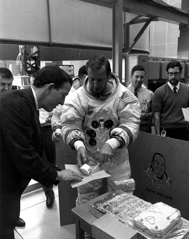 Jim Lovell serves pieces of his birthday cake. Photo filed 25 March 1970. Scan by Ed Hengeveld.70-H-446 ( 86k )