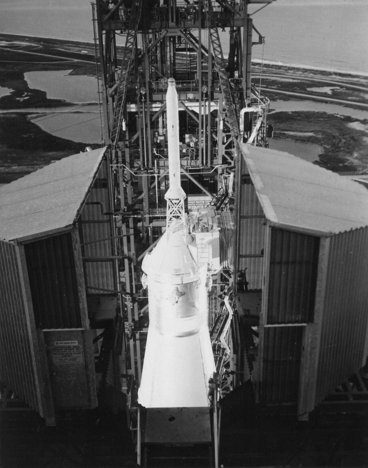 The Apollo 13 CSM and Escape Tower from the Mobile Service Structure. 25 March 1970. Research by J.L. Pickering.70-HC-351 ( 152k or 1227k )