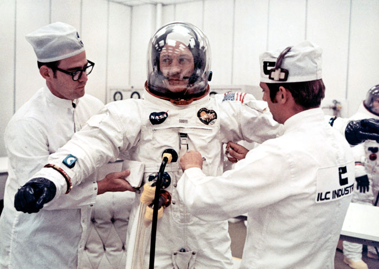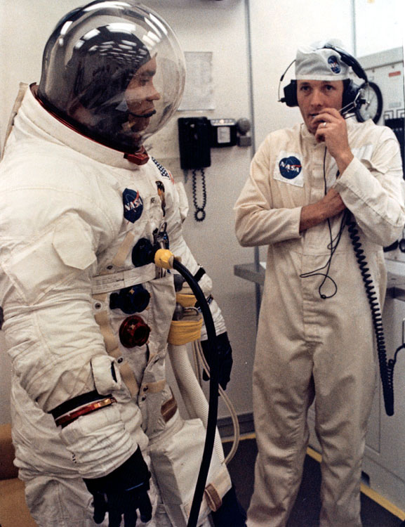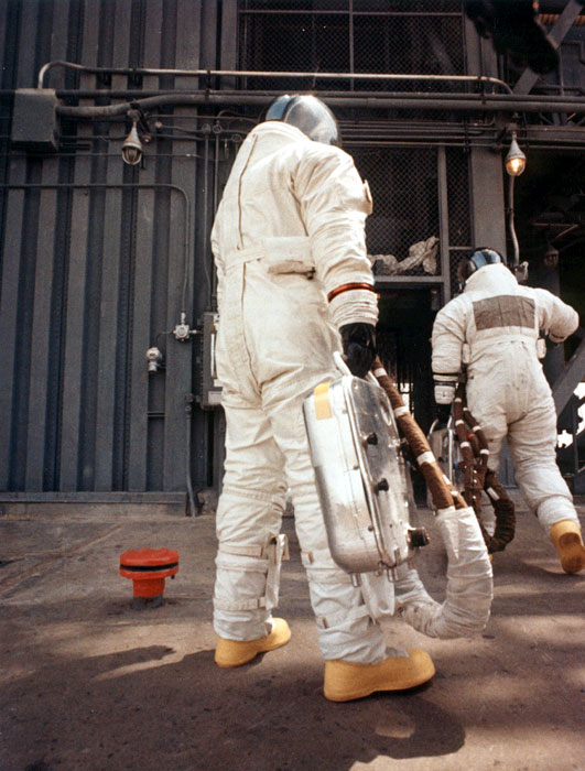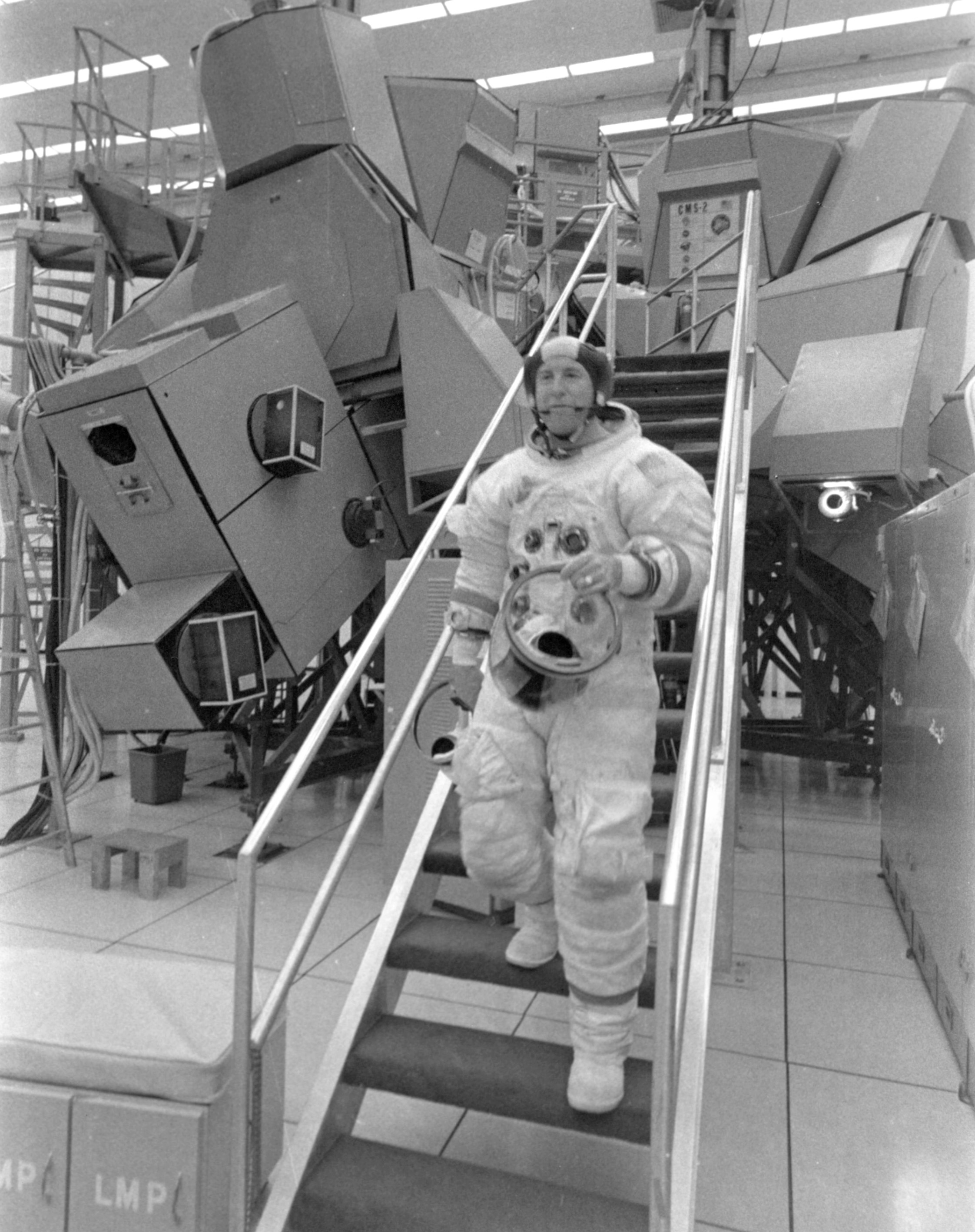 Apollo-13 backup CMP Jack Swigert prepares to enter spacecraft for altitude chamber test at KSC. September 1969. Scan by Ed Hengeveld.70-H-477 ( 151k or 1152k )