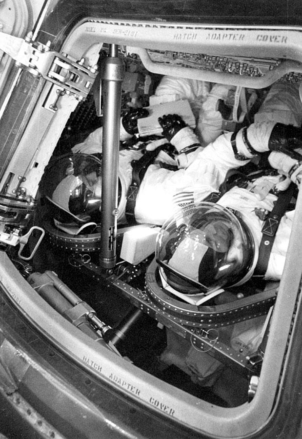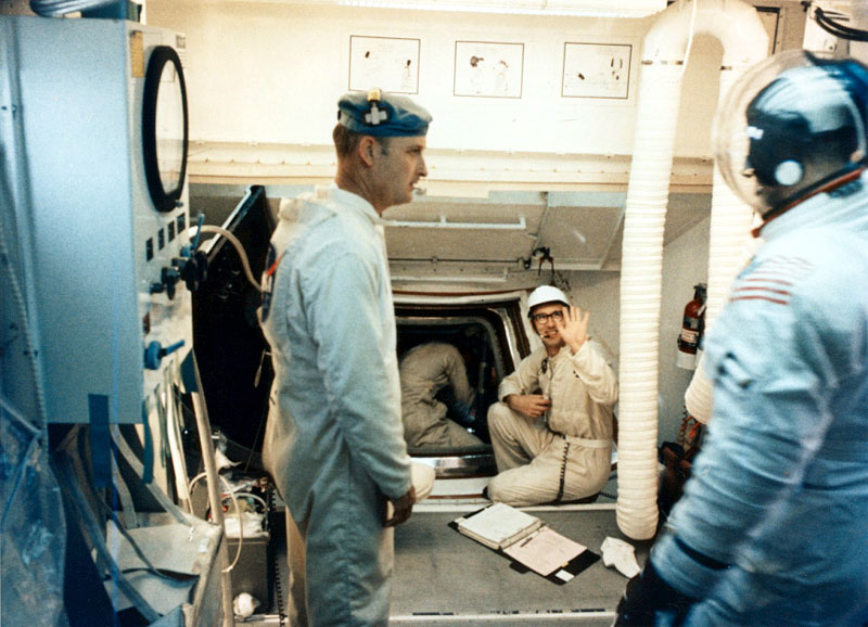 Jim Lovell manipulates a piece of equipment on the top of the Central Station while Back-up Commander John Young (back to us at right center) watches. Harald Kucharek notes that Jim is wearing an EVA glove. Scan by Ed Hengeveld.KSC-69PC-577 ( 80k )