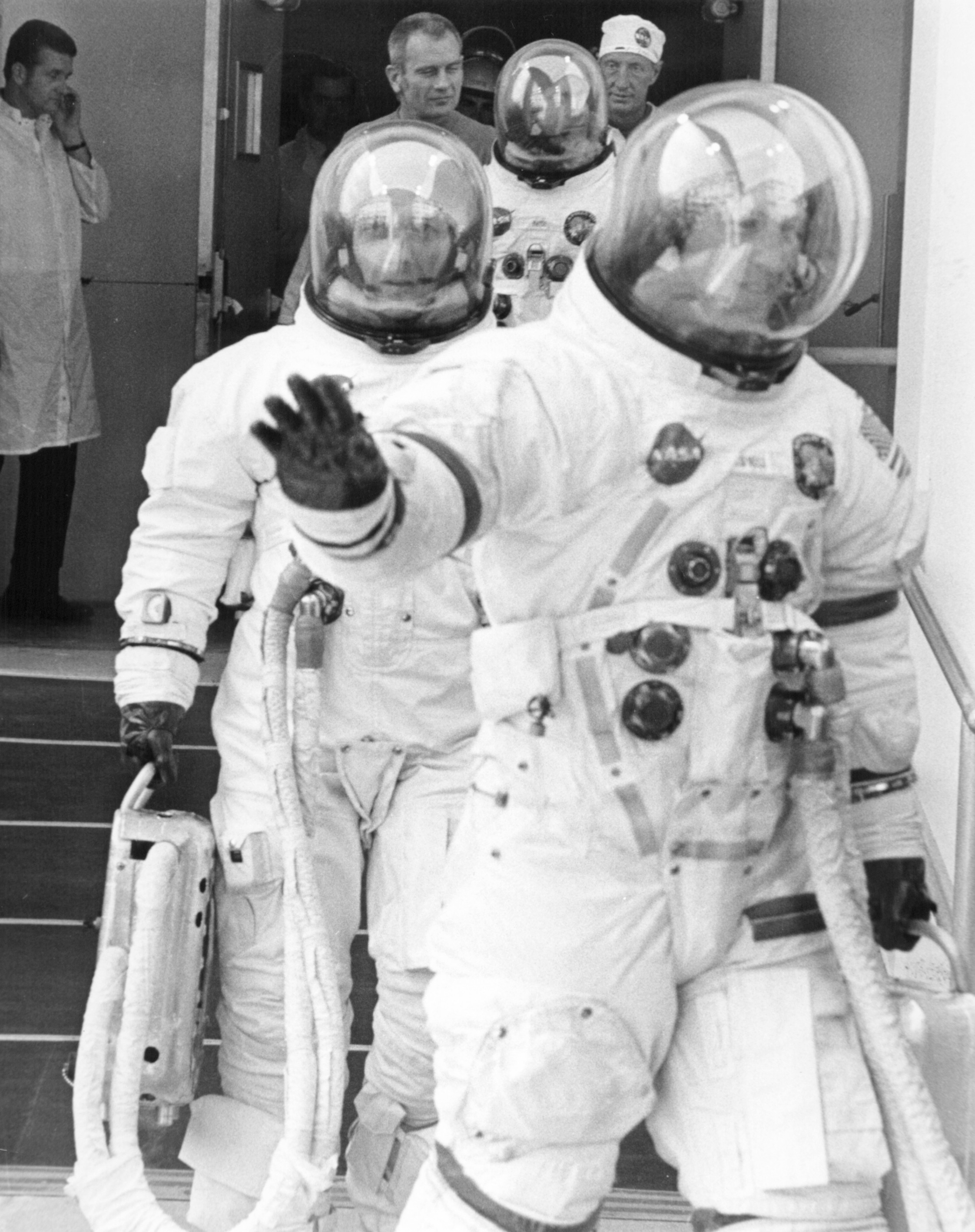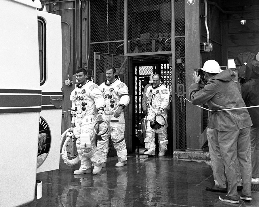 The Apollo 13 crew walks to the transfer van prior to the Countdown Demonstration Test. Photo filed 26 March 1970. Scan by Kipp Teague.70-H-450 ( 86k )