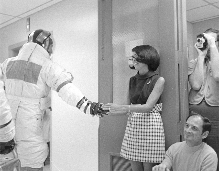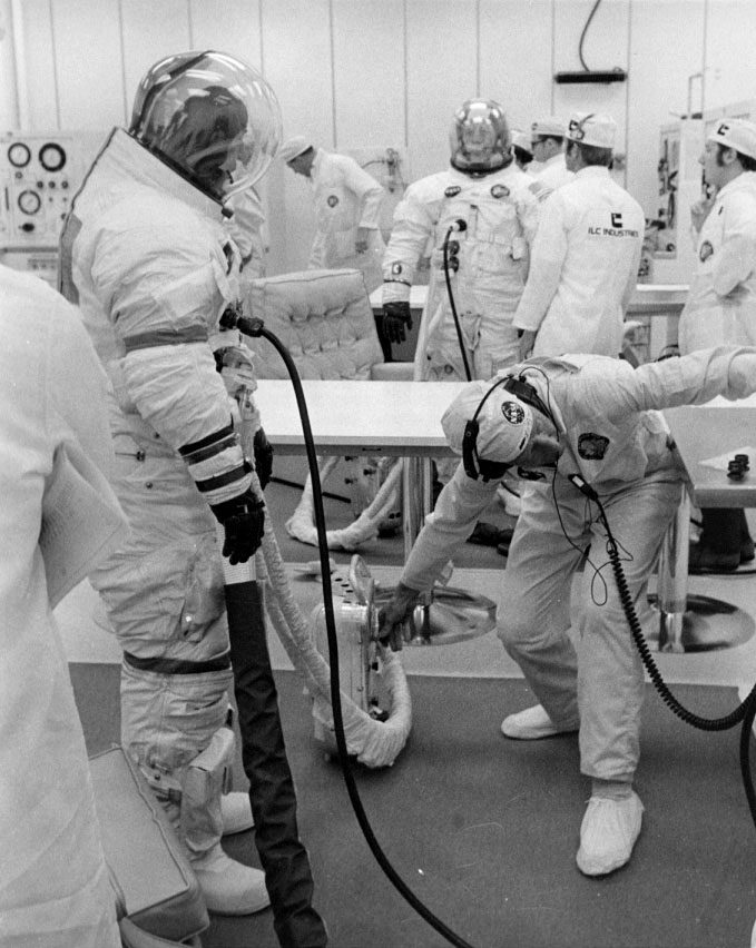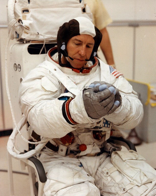 Jim Lovell checks the gauntlet that will cover the lock rings that connect his glove to the suit. Note that Lovell does not have a distinguishing stripe on his arm at this time. 28 January 1970. Scan by Ed Hengeveld.S70-29672 ( 163k or 1170k )