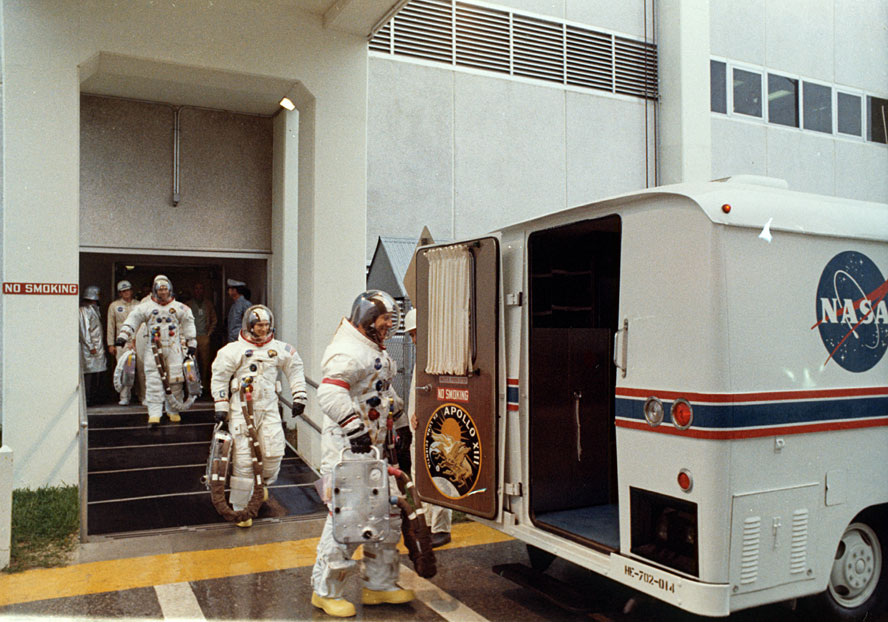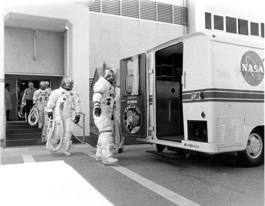 Fred Haise (left), Jim Lovell, and Ken Mattingly board the transfer van after the successful completion of the Countdown Demonstration Test. 26 March 1970. Scan courtesy NASA KSC.S70-32726 ( 1.5 Mb or 141k )