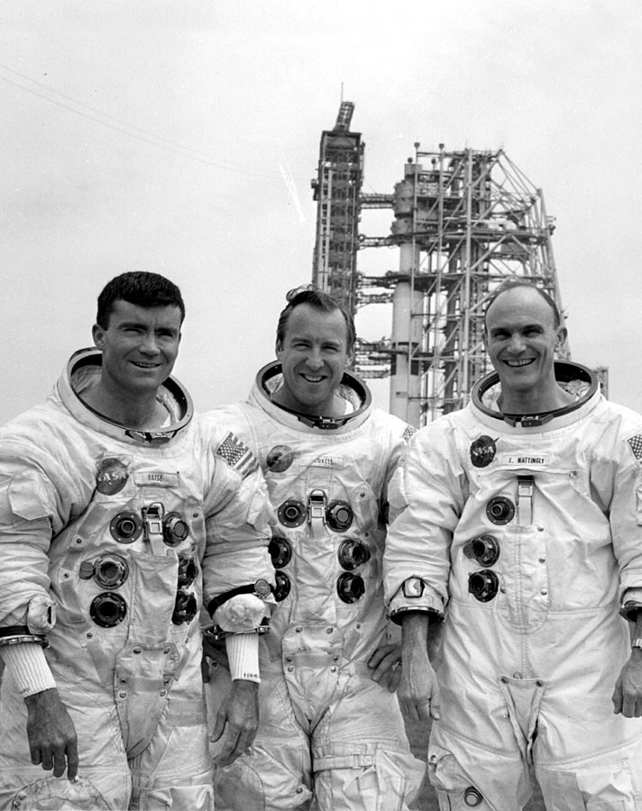 Fred Haise (left) Jim Lovell, and Ken Mattingly pose in front of the launch pad. 6 April 1970. Scan by Kipp Teague.70-H-621 ( 135k or 839k )