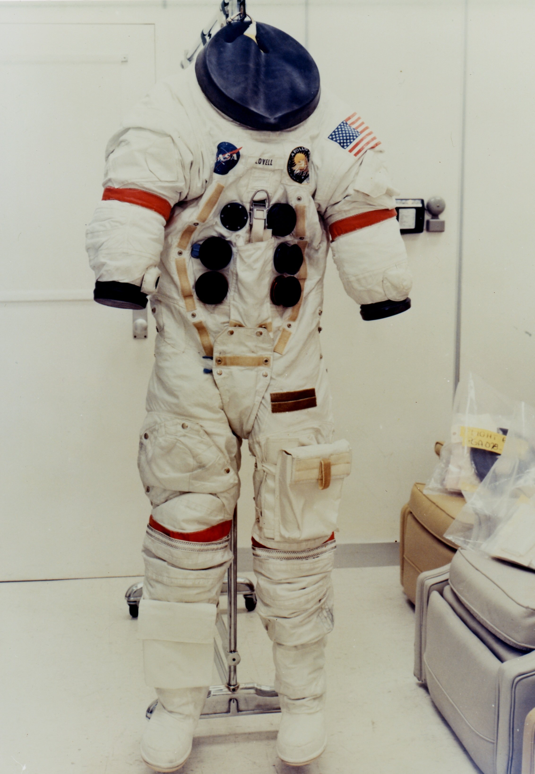 Jim Lovell's flown LEVA, photographed at the Adler Planetarium by Arthur de Wolf This version of the LEVA was first flown on Apollo 13 and included a central eyeshade with a raisable flap. It also included what is known as the 'CDR stripe' introduced at the request of NASA Public Affairs to distinguish between the two LM crewmembers in photographs. On later missions, the stripe was solid red. Lovell obtained NASA permission to incorporate a US Navy anchor on his CDR stripe.