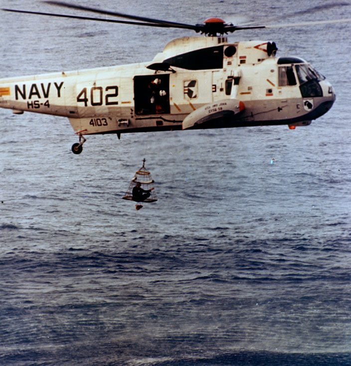 Jack Swigert is raised to the recovery helicopter after splashdown. 17 April 1970. Scan by Ed Hengeveld.KSC-70PC-0130 ( 57k )