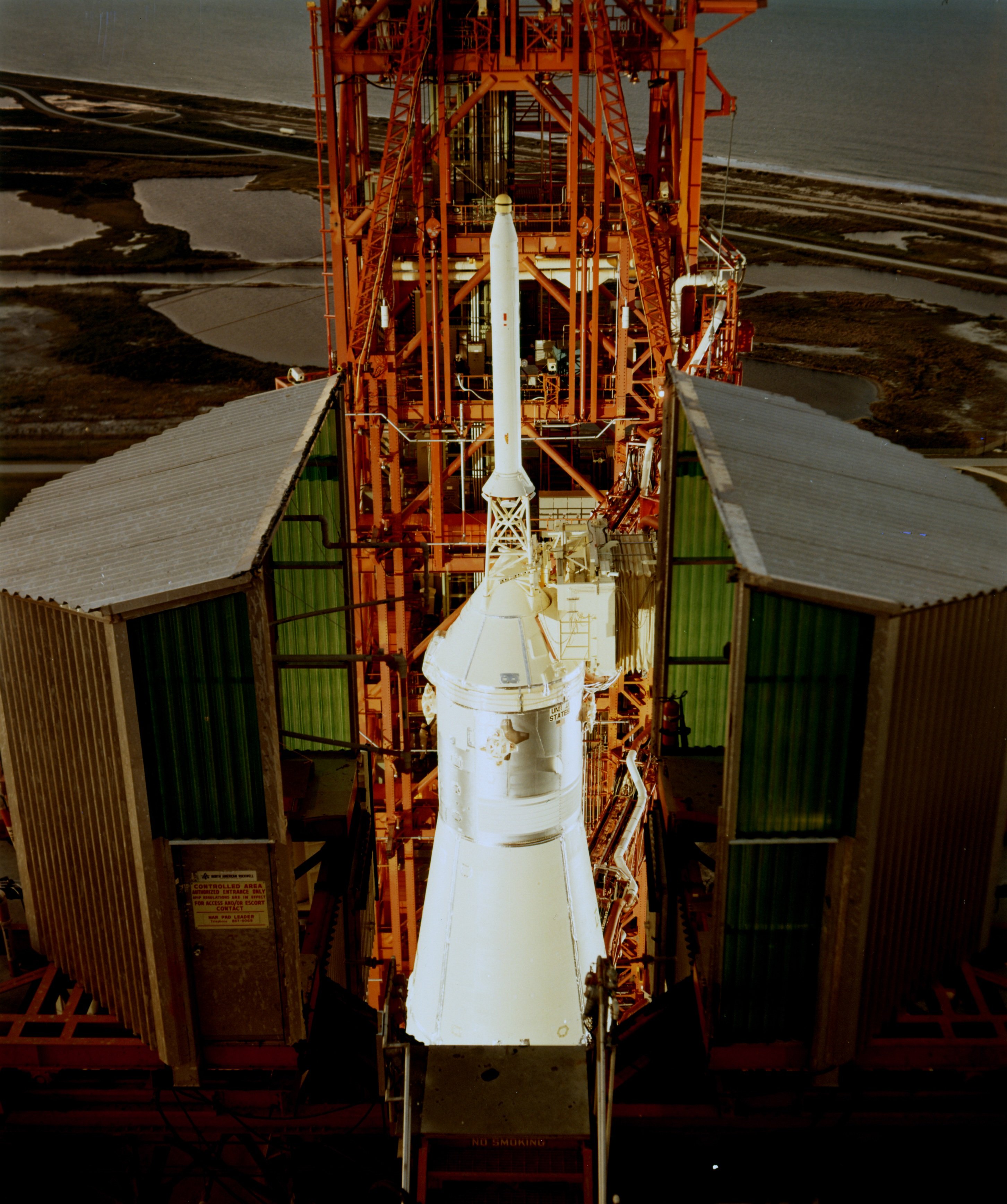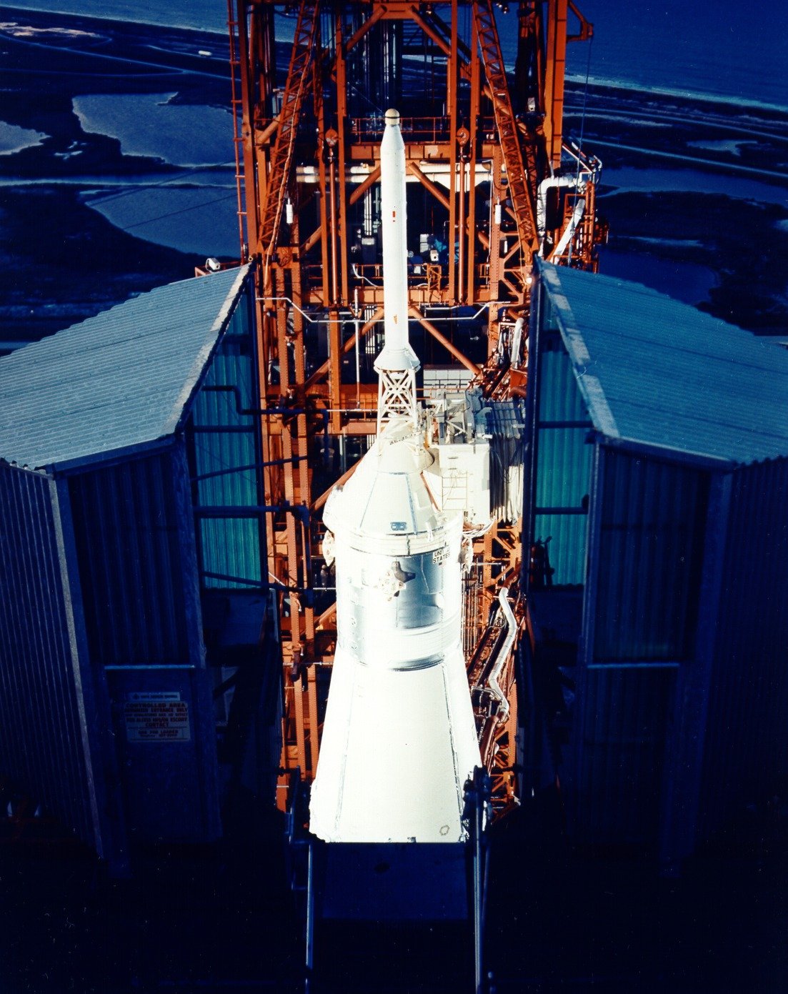 The Apollo 13 CSM and Escape Tower from the Mobile Service Structure. 24 March 1970. Scan by Kipp Teague.70-HC-536 ( 176k or 1213k )