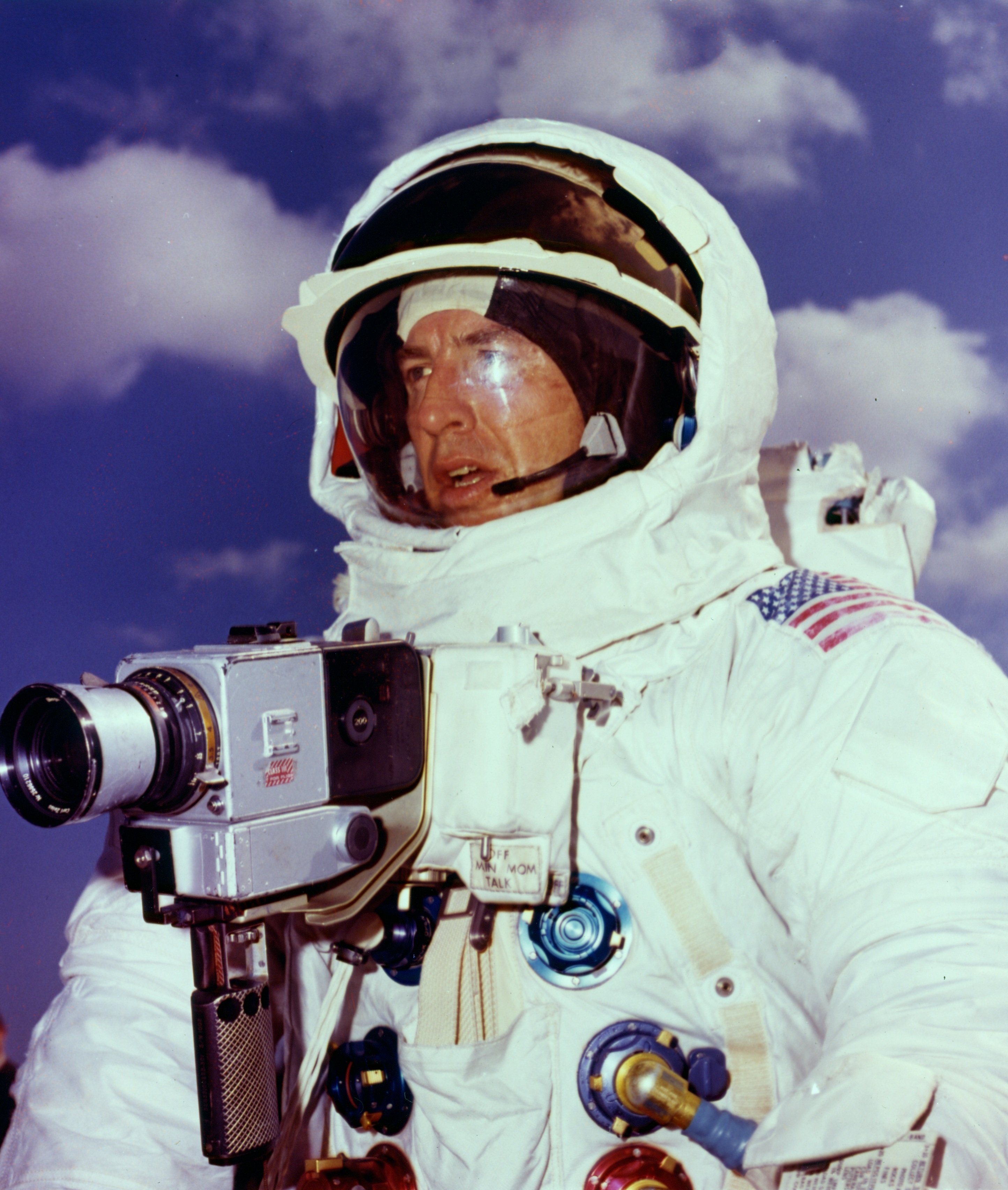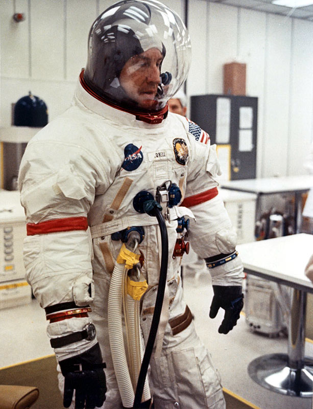 Excellent view of Jim Lovell's chest-mounted Hasselblad camera during EVA training. Photo filed 3 February 1970. Scan by Kipp Teague.70-HC-75 ( 120k or 964k )
