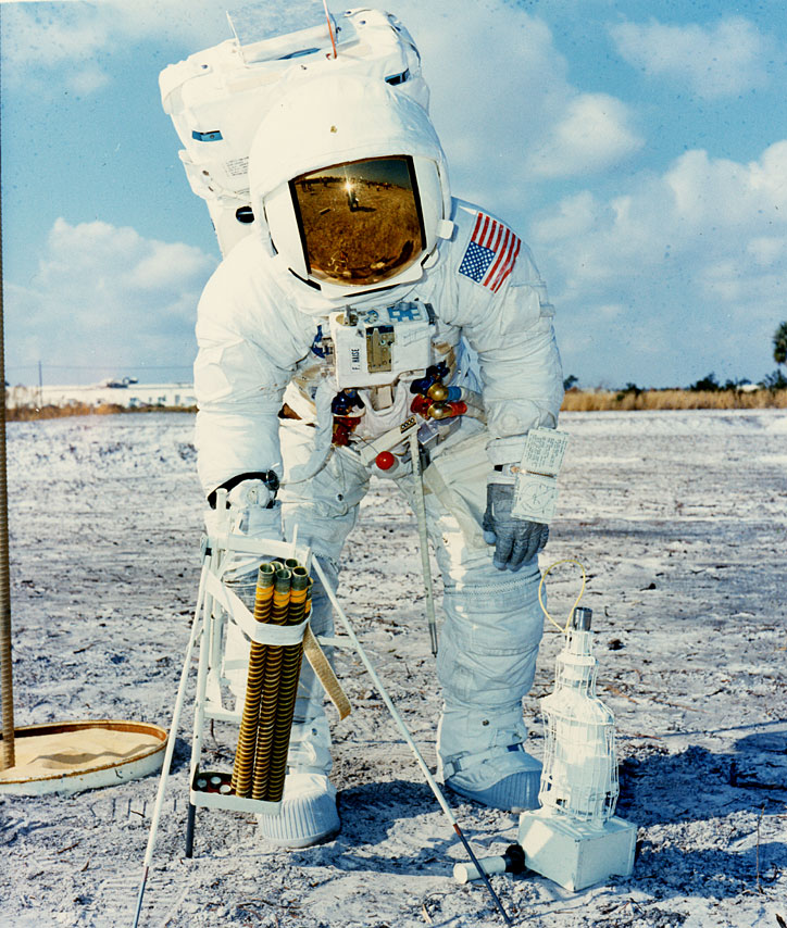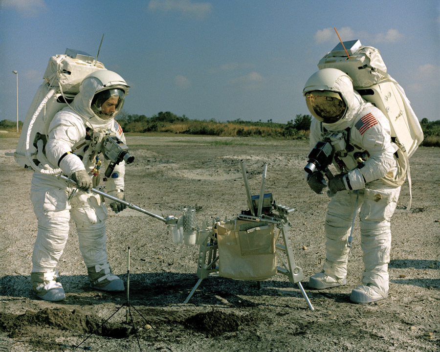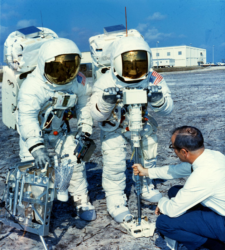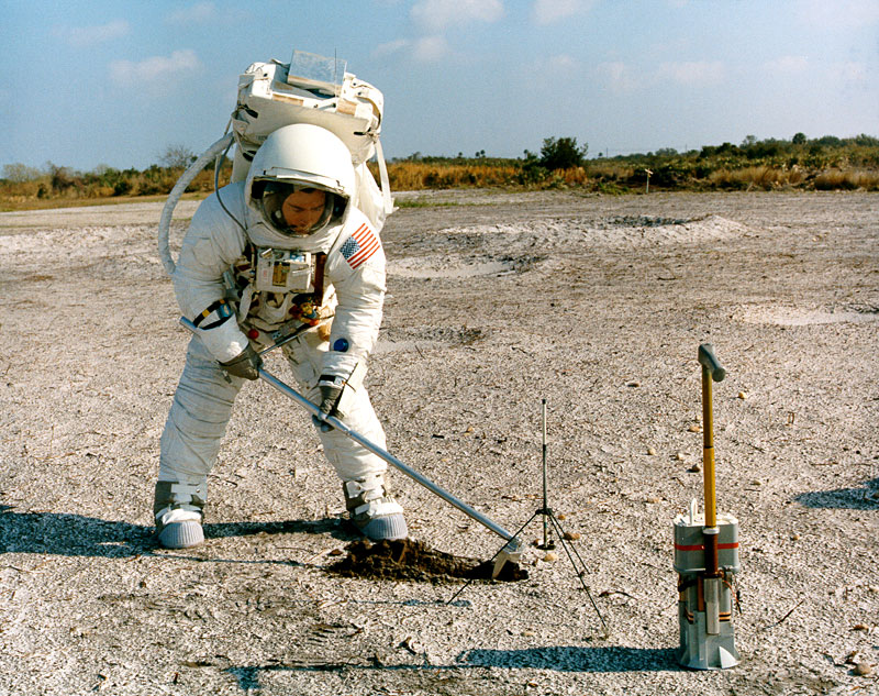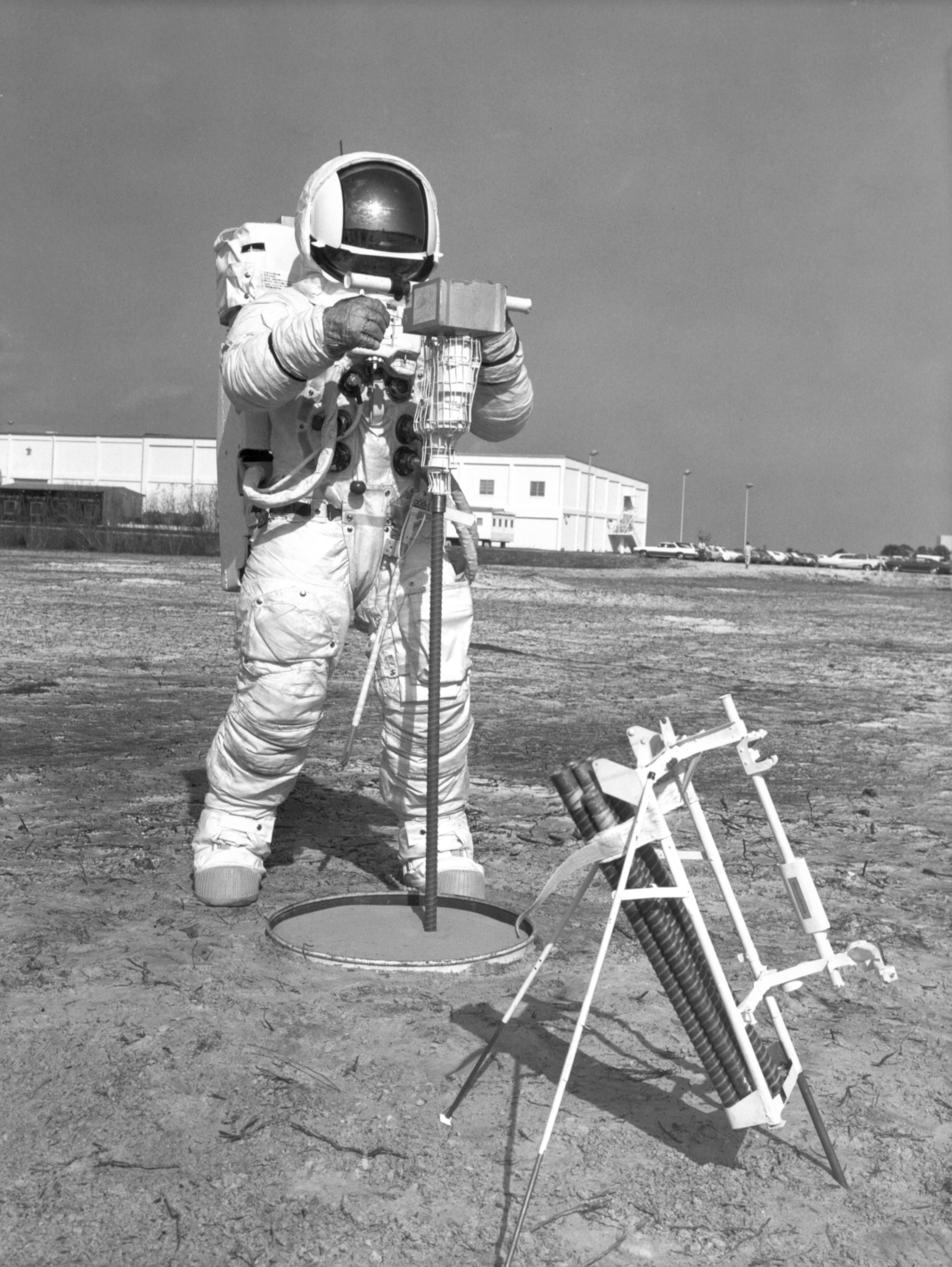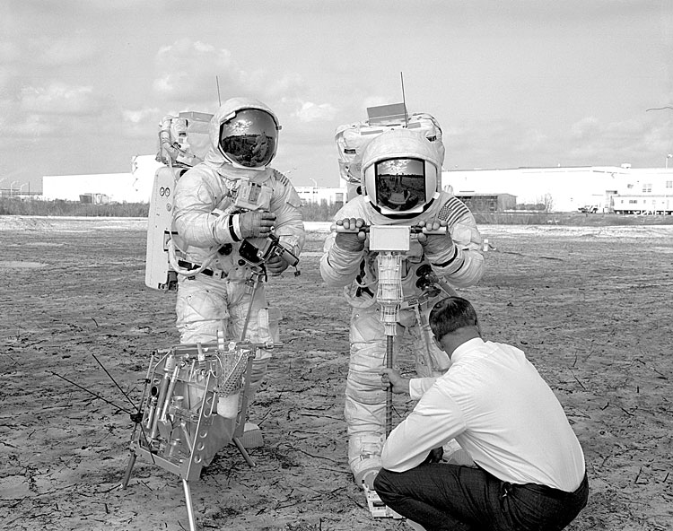 Fred Haise has a Universal Handling Tool (UHT) in his right hand. The drill is at his right and drill stem rack is at his left. On the Moon, Fred plans to drill to two holes to the heat flow experiment and one core hole. In drilling the core hole, he uses six 42.5-cm stem, emplacing one stem and then attaching the next before extracting the entire string. Here, he has evidently just drawn the string out of the buried container which contains lunar soil simulant. As Dave Scott discovered on Apollo 15, lunar soil is more compact than expected at depth and extraction of the core was extremely difficult. Later crews had a jack and treadle to help with the extraction. 28 January 1970. Scan by Ed Hengeveld.KSC-70PC-12 ( 144k or 353k )