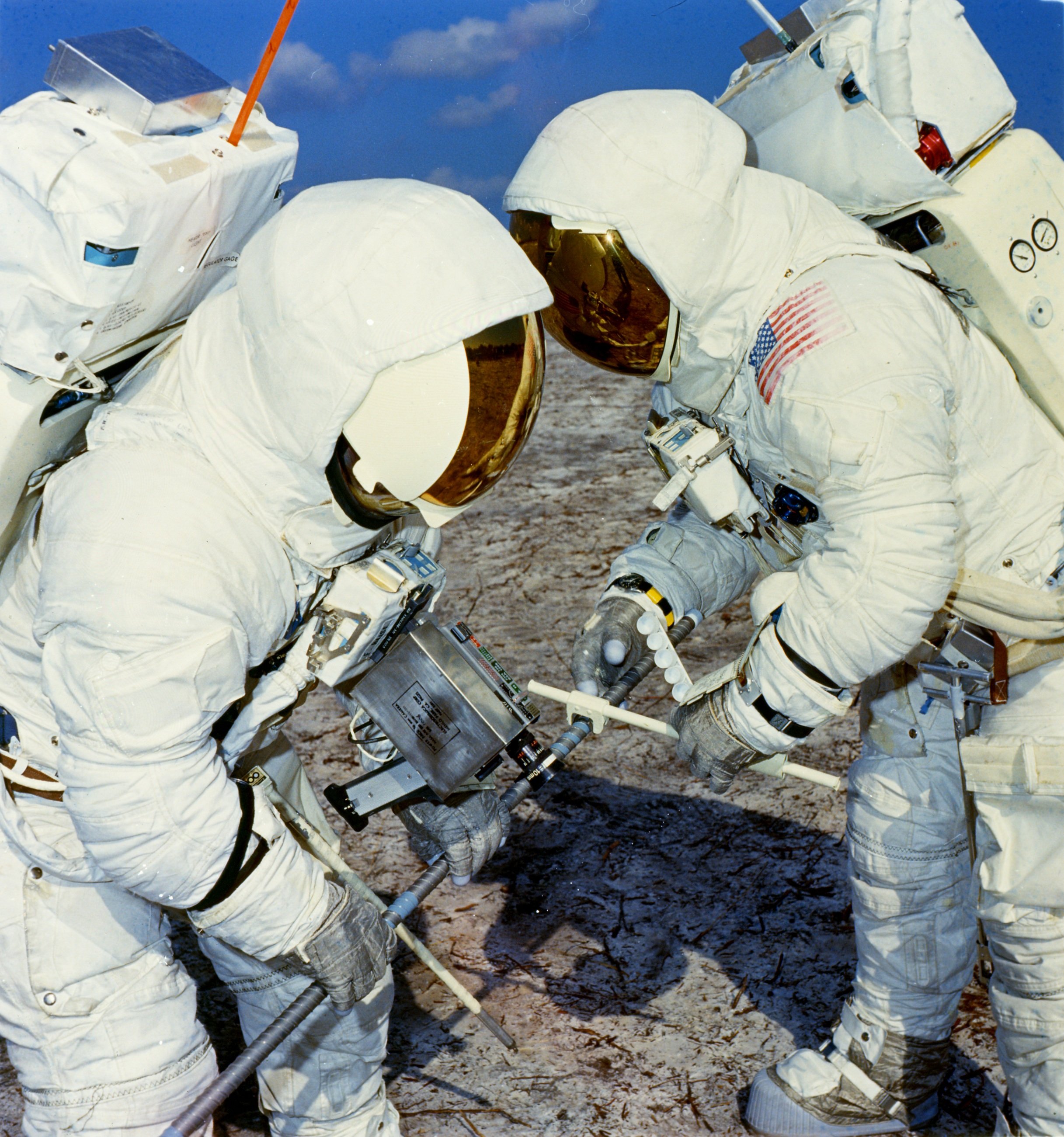 Fred Haise positions the drill stem rack during training. The battery-powered drill is at his left and a buried can filled with lunar soil simulant is on the righthand side of the picture. Note the wide pitch - perhaps 1 cm - of the thread on the drill stems. Fred has his watch on his right arm and, as can be seen in good detail in this photo, a spiral-bound checklist on his left wrist. A Universal Handling Tool (UHT) is attached to the yo-yo at his waist. Note the pattern of Velcro strips on the top of his OPS and the fact that he has his side visors down. Note, also, that Fred's OPS antenna has a red color, whereas Jim's in prior images had a silver color. Photo filed 3 February 1970. Scan by Kipp Teague.70-H-293 ( 87k )