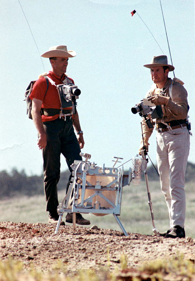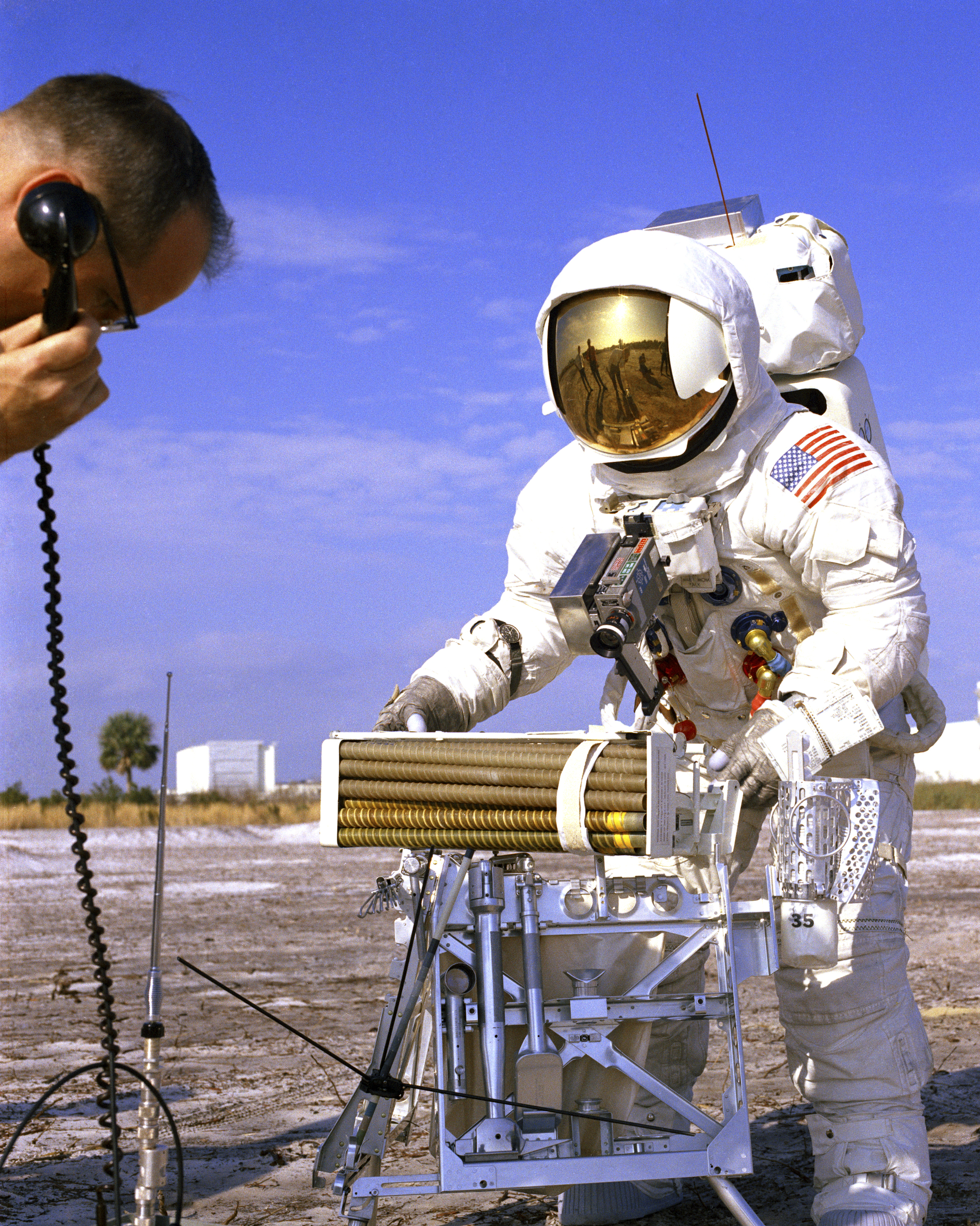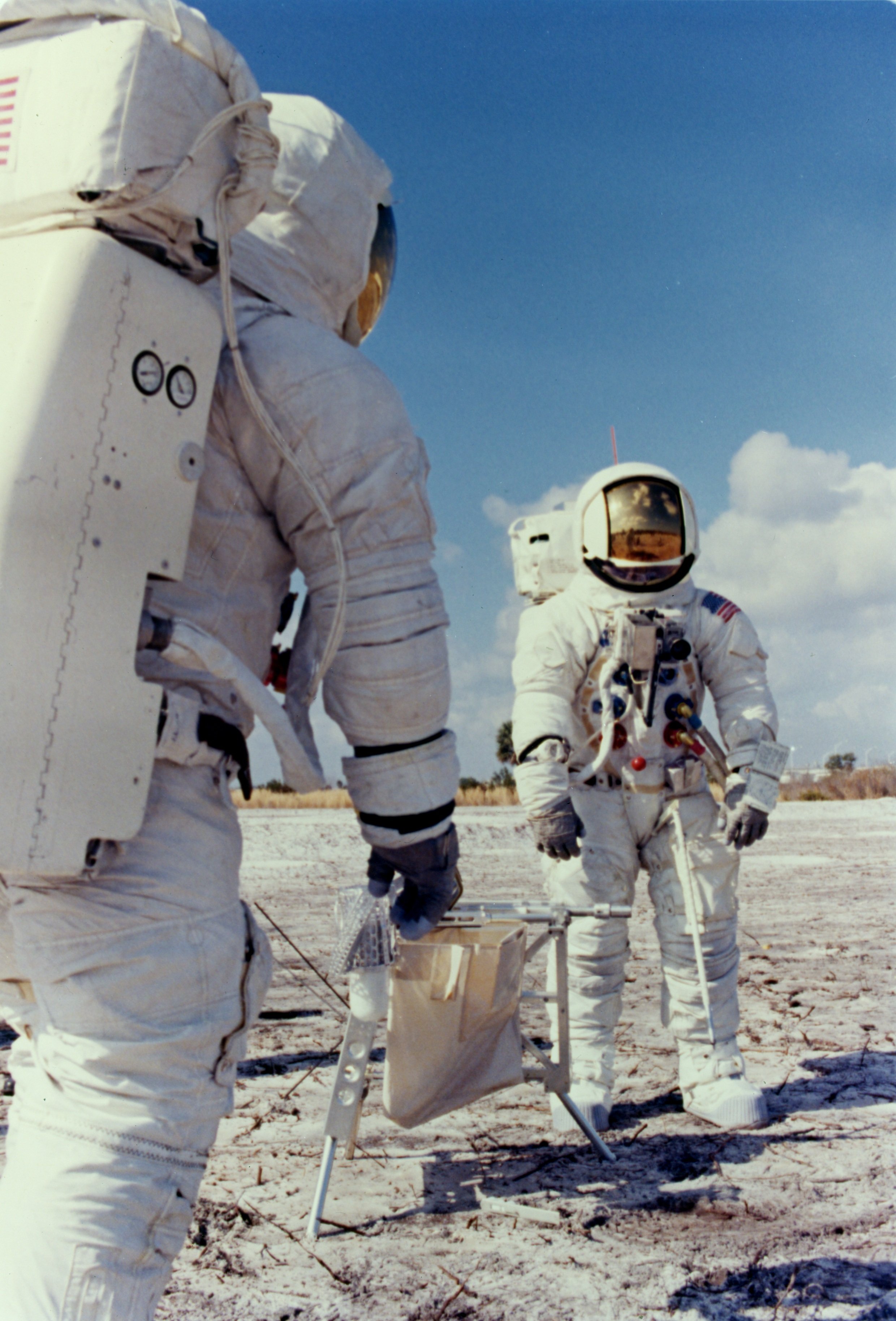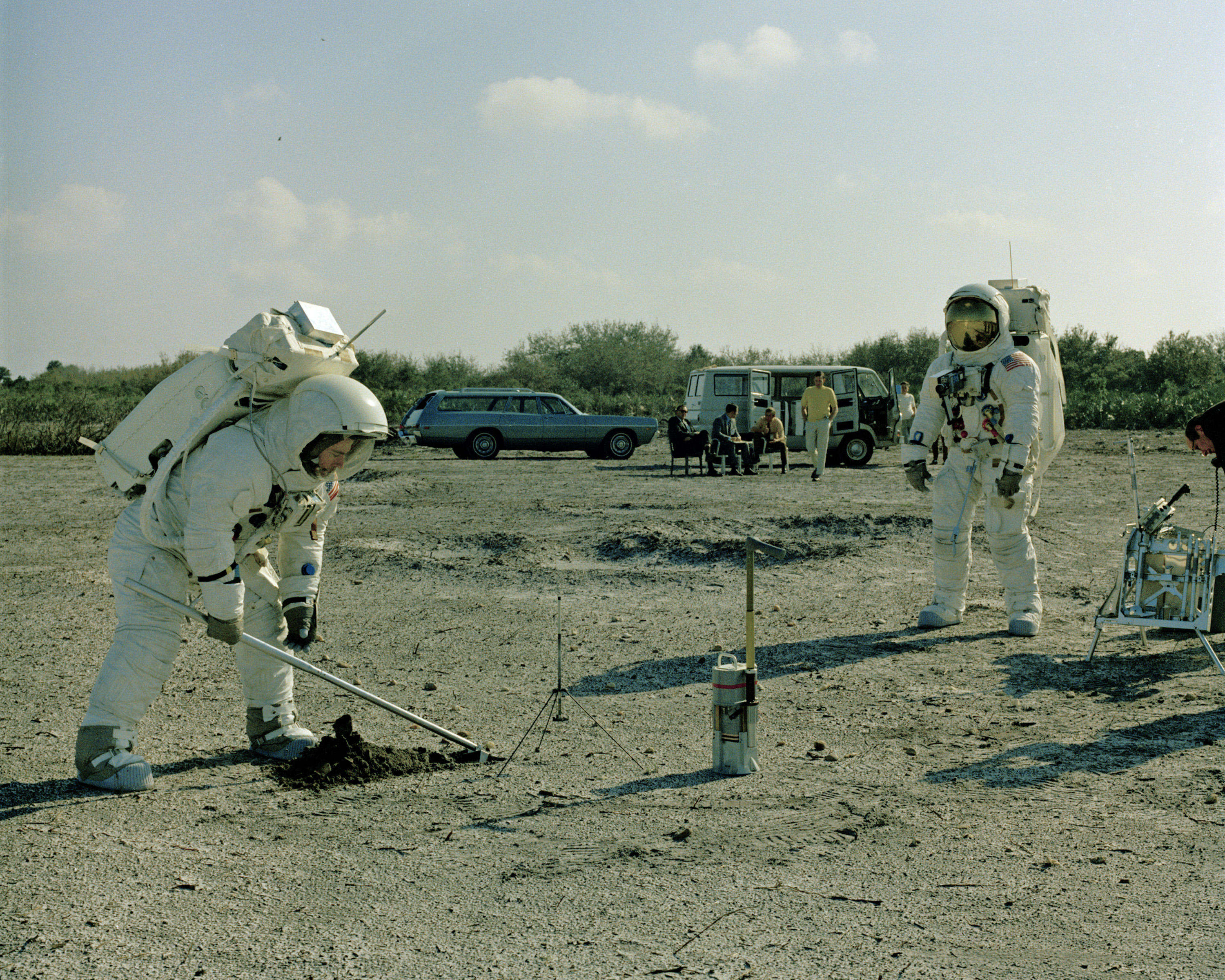 Side view of John Young trenching at the Cape, with Charlie Duke watching. Note that Charlie appears to have a battery-powered DAC mounted on his RCU. The Apollo Lunar Surface Close-up Camera is to the right of the gnomon. 19 February 1970. Scan courtesy Maggie Persinger, KSC.KSC-70PC-67 (0.3 Mb or 2.9 Mb)