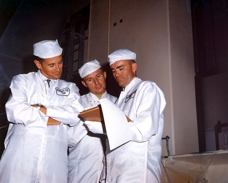 In the White Room, Pad Leader Guenter Wendt jokes with a member of the Apollo 13 crew while Jim Lovell (center) watches. Photo filed 26 March 1970. Scan by Ed Hengeveld.KSC-70P-130 ( 86k )