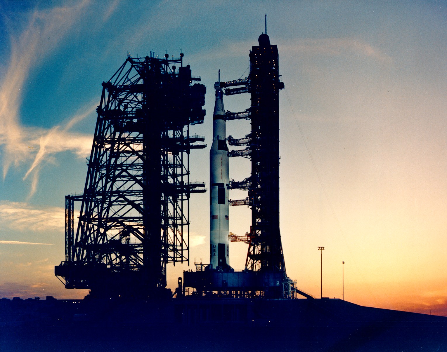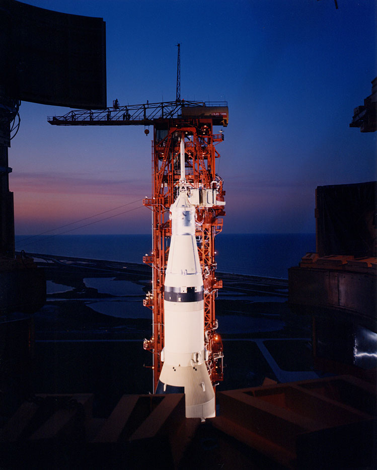 Apollo 13 silhouetted by sunset following MSS pullback. 10 April 1970. Research by J.L. Pickering.KSC-70C-1494 ( 176k or 1044k )