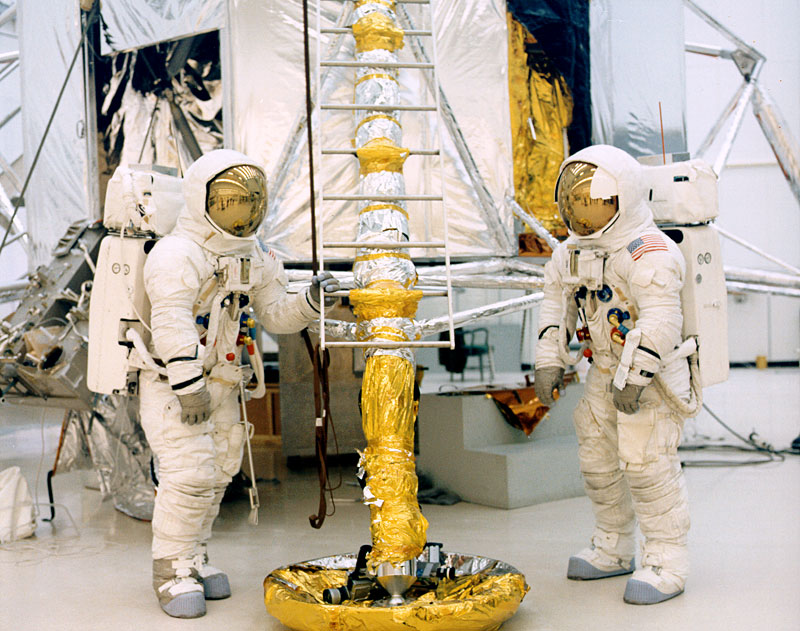 Jim Lovell, who is carrying the ALSEP packages in the foreground, and Fred Haise, who is in the background with the Hand Tool Carrier (HTC), conduct a walk-through of EVA timeline at KSC. A Universal Handling Tool (UHT) sticks up on a diagonal out of each of the packages. In Lovell's flown cuff checklist, the UHTs are called 'putters', no doubt because of their resemblance golf 'putters'. The RTG package is on Jim's left. 28 January 1970. Scan by Ed Hengeveld.KSC-70PC-11 ( 96k )